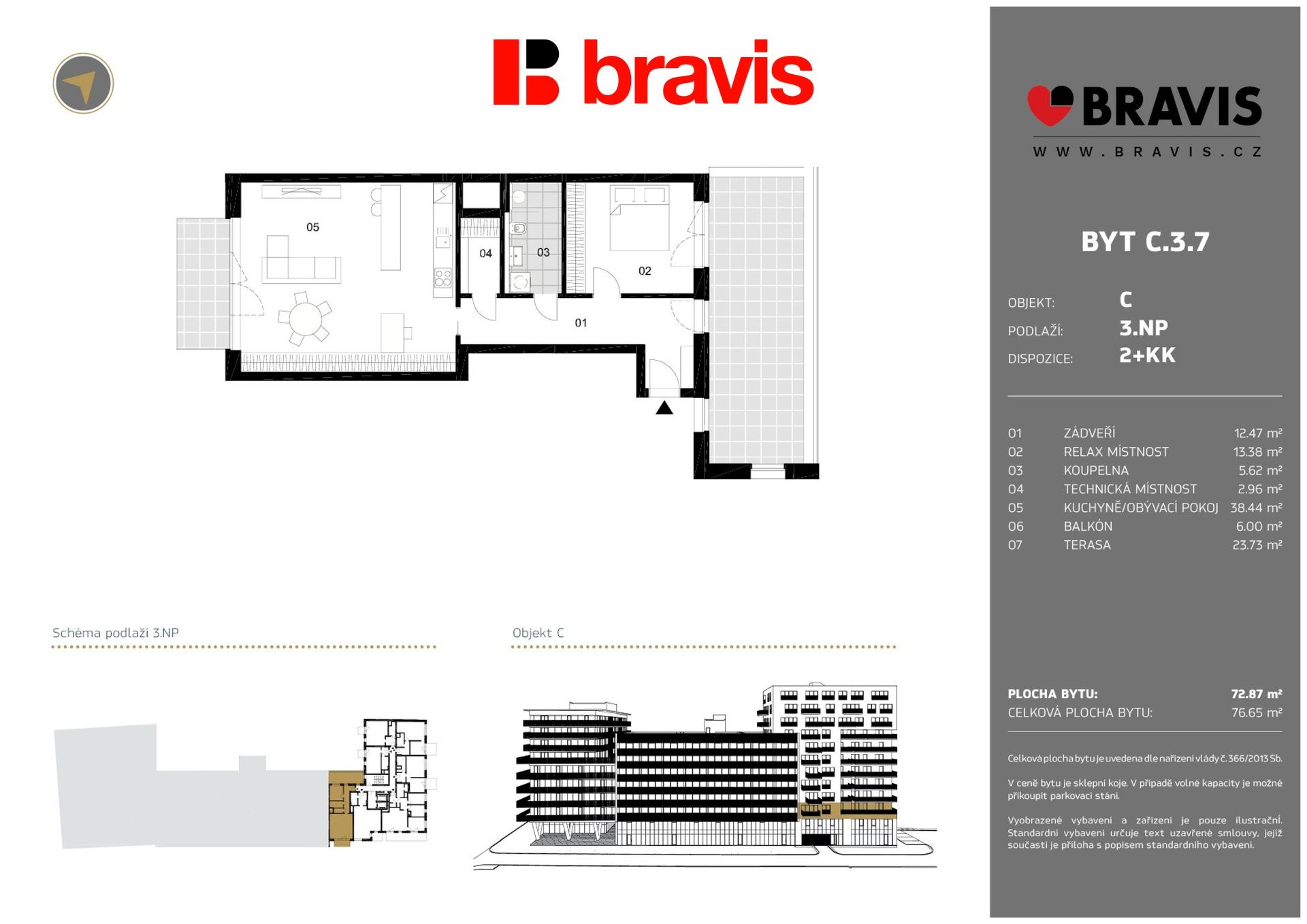 Bytová jednotka o celkové ploše 76 m2 disponuje terasou 24 m2, balkonem 6 m2 a sklepem a je situována ve 3. nadzemním podlaží polyfunkčního domu na ulici Fuchsova, jen několik kroků od katedrály sv. Petra a Pavla či hradu Špilberk.
