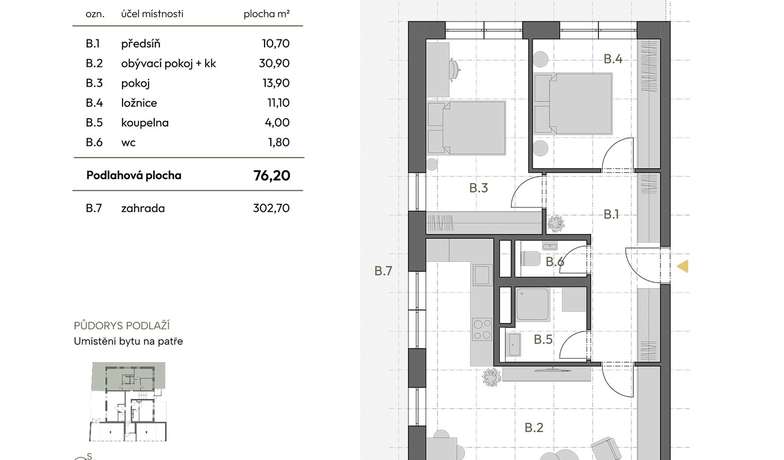 Celková užitná plocha bytu činí 76,2 m², což v kombinaci s velkou zahradou vytváří ideální prostor pro všechny členy domácnosti.