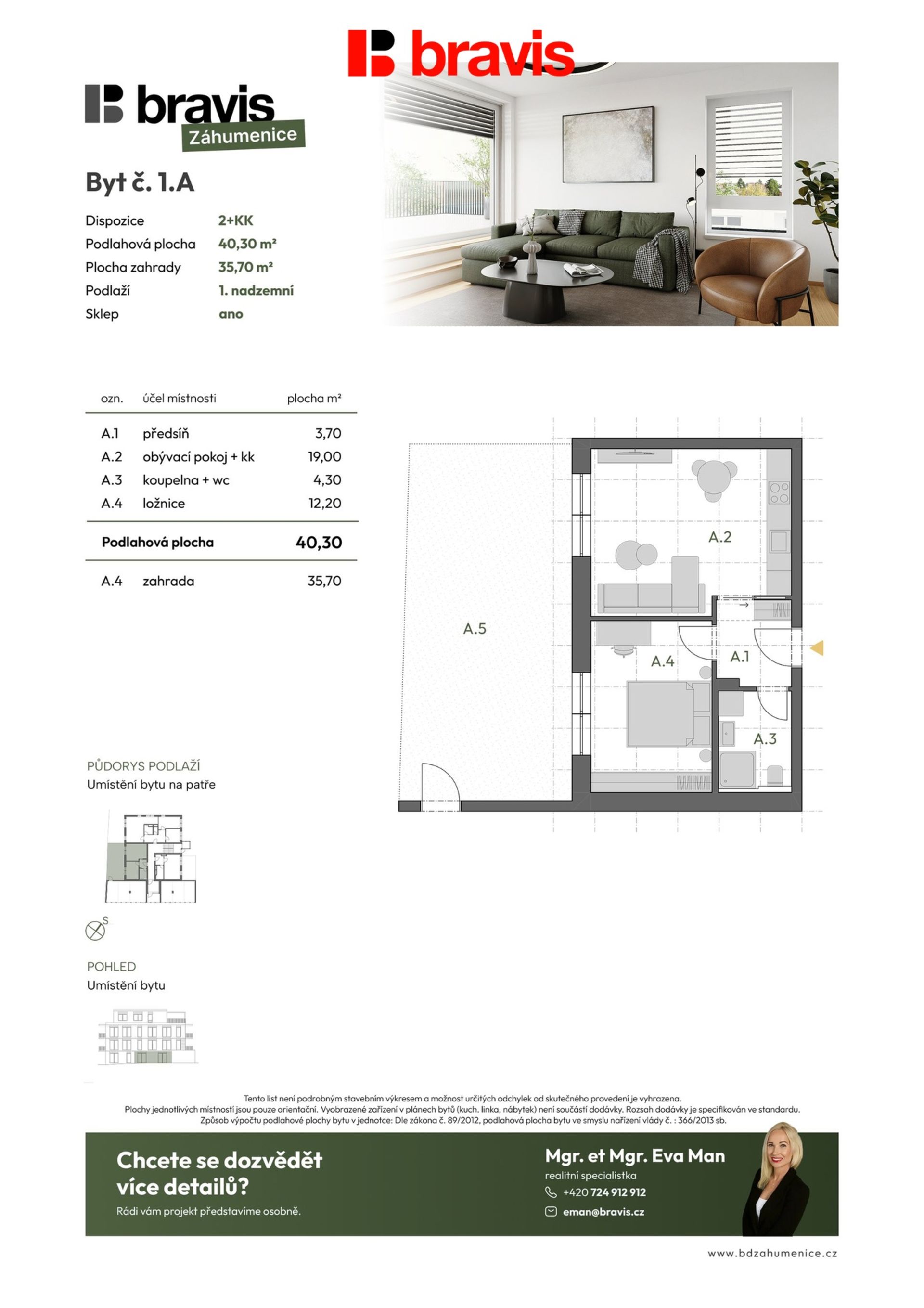 Celková užitná plocha bytu činí 40,3 m², což v kombinaci s velkou zahradou vytváří ideální prostor pro budoucí majitele bytu.