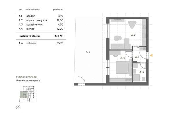 Celková užitná plocha bytu činí 40,3 m², což v kombinaci s velkou zahradou vytváří ideální prostor pro budoucí majitele bytu.