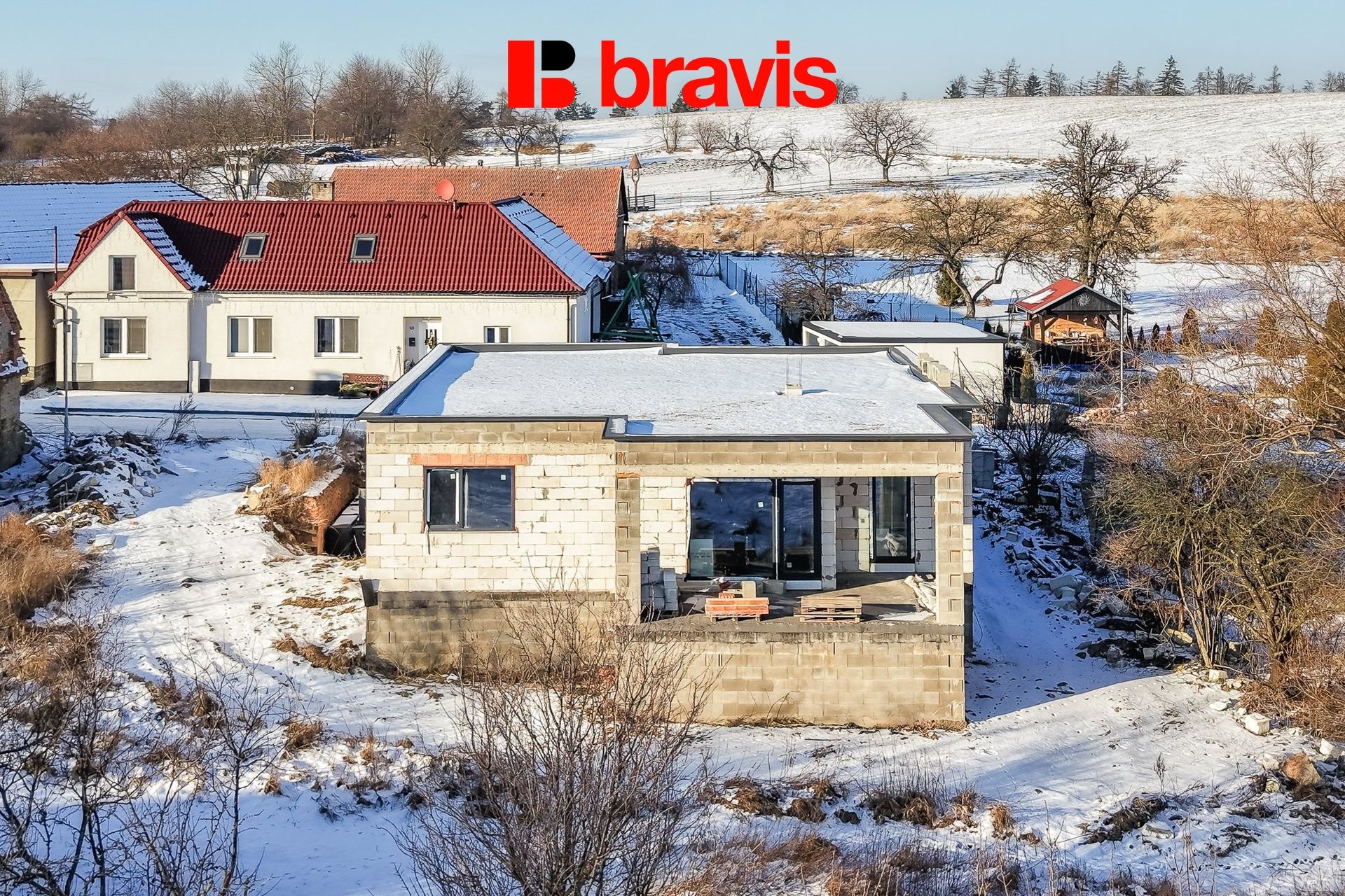 Dům je situován na pozemku o celkové výměře 551 m2 a je prodáván ve fázi hrubé stavby, což novému majiteli umožňuje dokončení dle vlastních představ a potřeb.