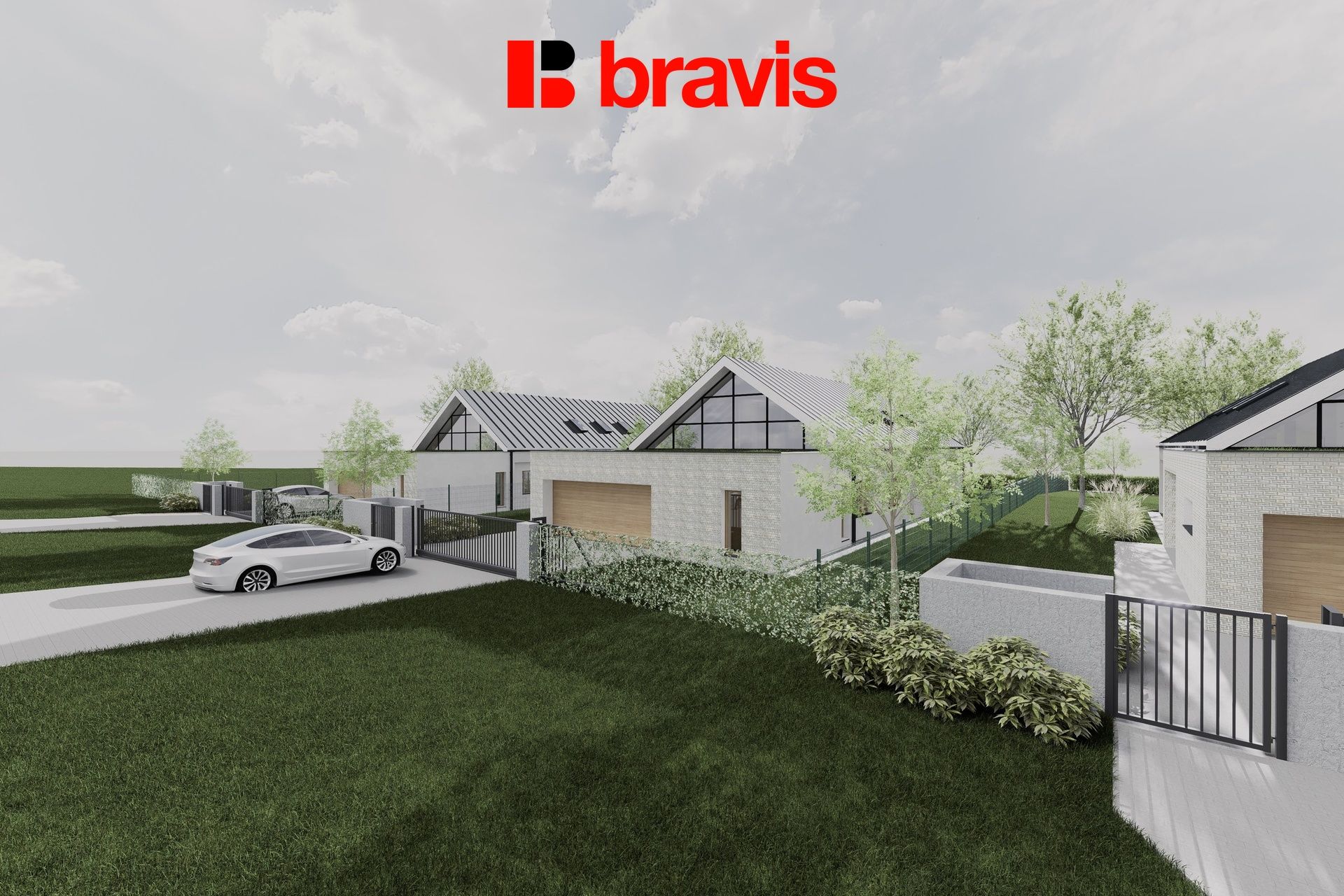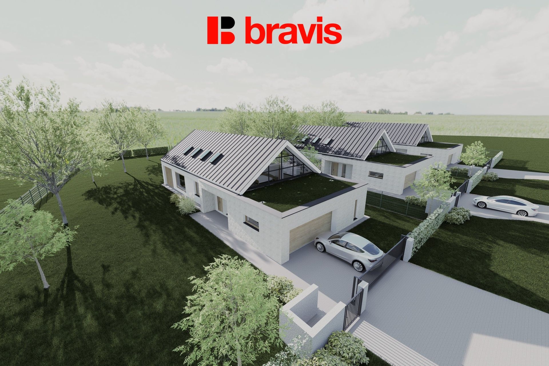 Projekt zahrnuje veškeré podklady na výstabvu třech nízkoenergetických rodinných domů s nadstandardním vybavením, dvojgaráží, terasou a dispozicemi 5+kk.