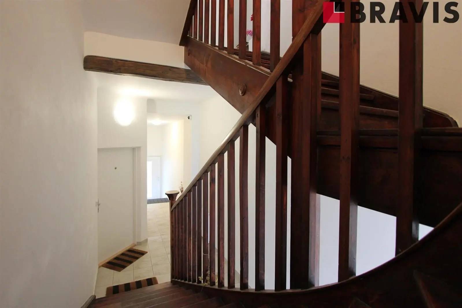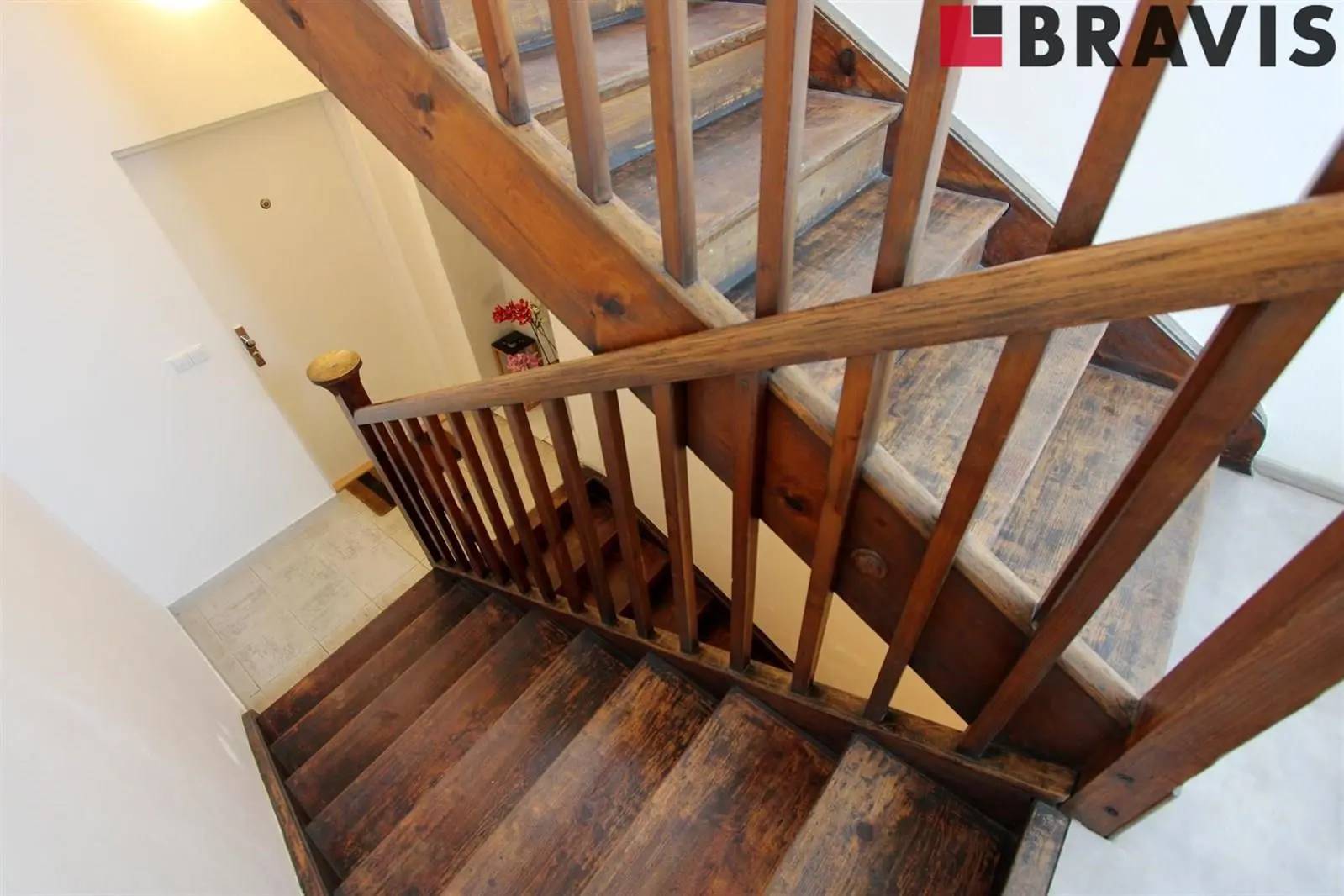 Bylo zachované a zrepasované dřevěné schodiště spojující všechna podlaží.