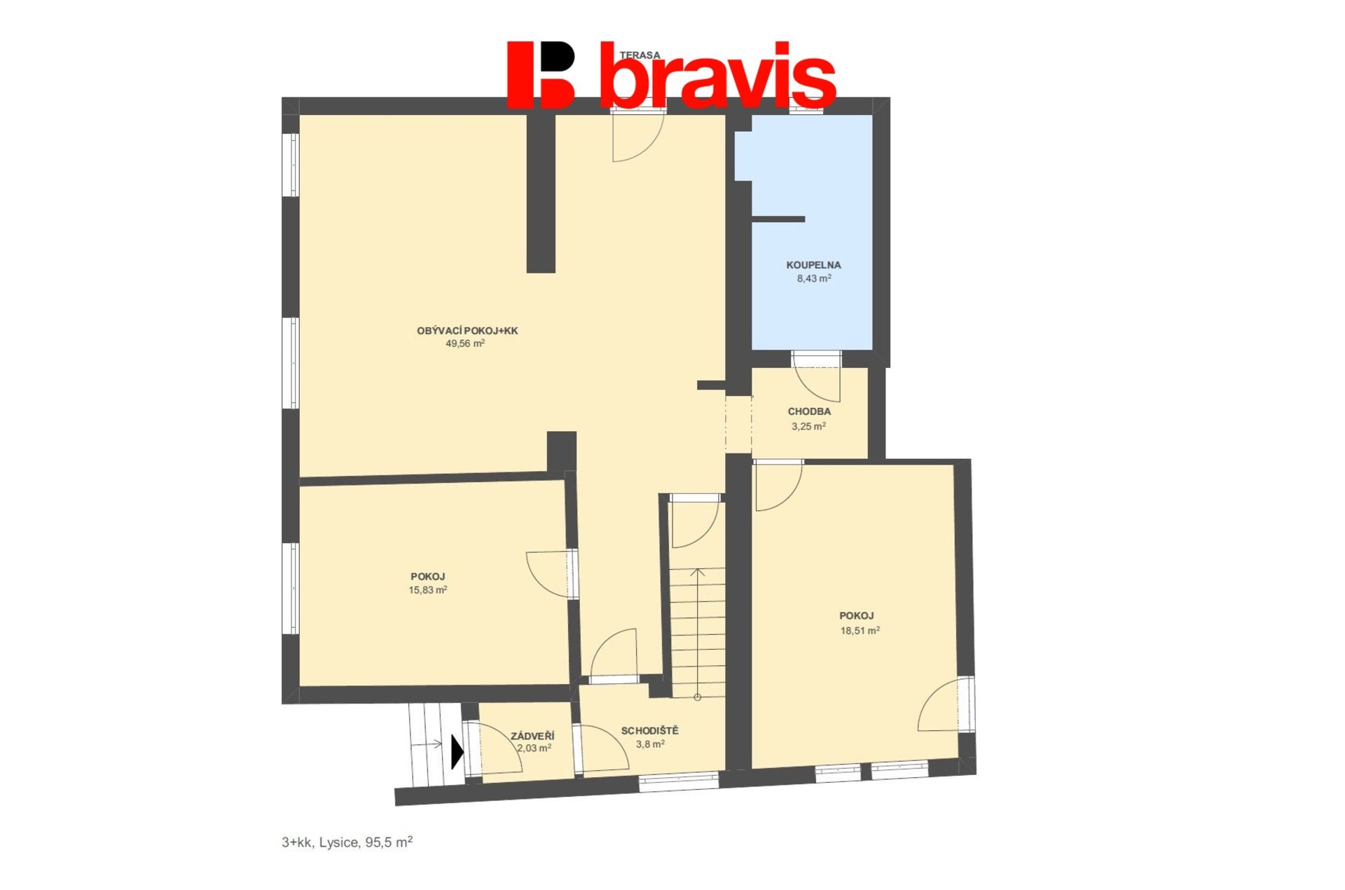 Světlý byt umístěný v patře domu nabízí čtyři místnosti, kuchyni, koupelnu, samostatnou toaletu a přístup na půdu o rozloze 62 m2. Vstup do bytu vede z předsíně sdílené s bytem 3+kk a nabízí se možnost vybudování vlastního vchodu přímo do ulice.