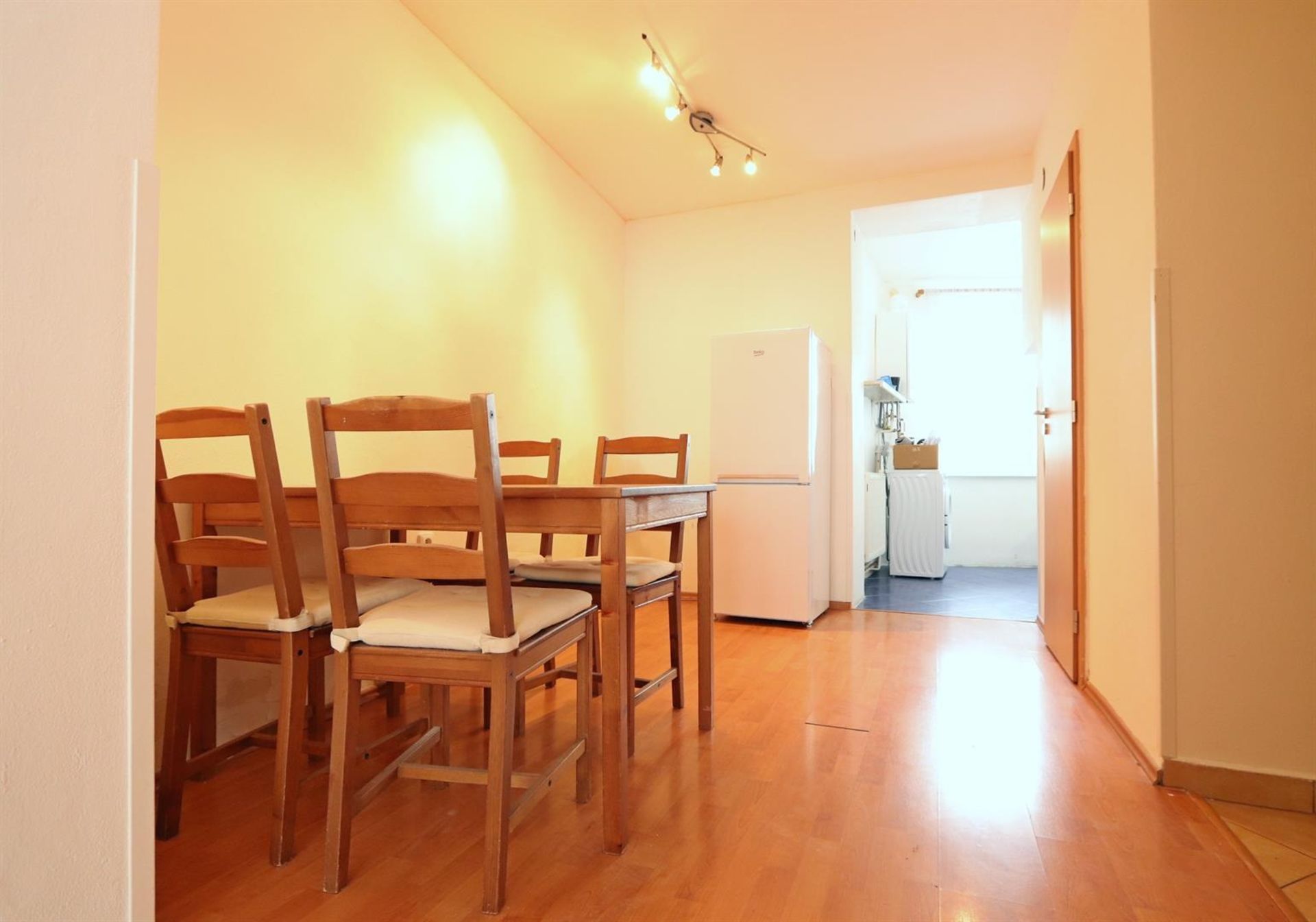 Z kuchyně je přístup do prostorné předsíně, ve které se nachází jídelní stůl se čtyřmi židlemi.