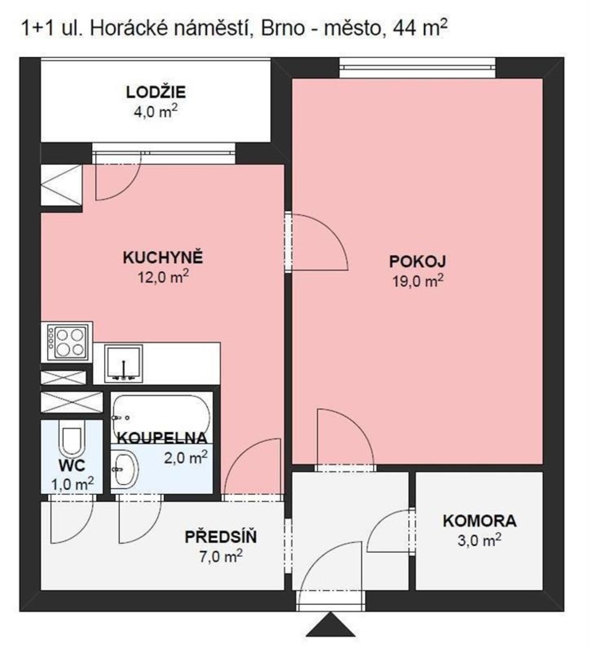 pokoj 19 m2, kuchyně 12 m2, předsíň 7 m2, koupelna 2 m2, toaleta 1 m2, šatna 3 m2, lodžie 4 m2.