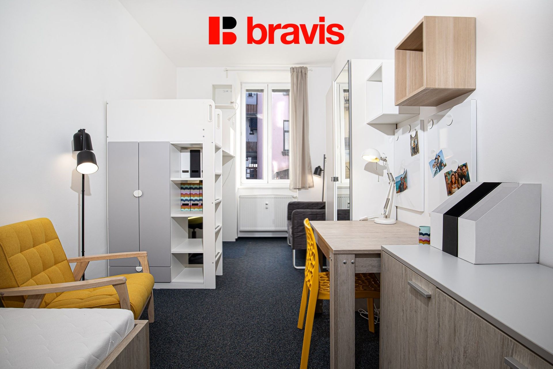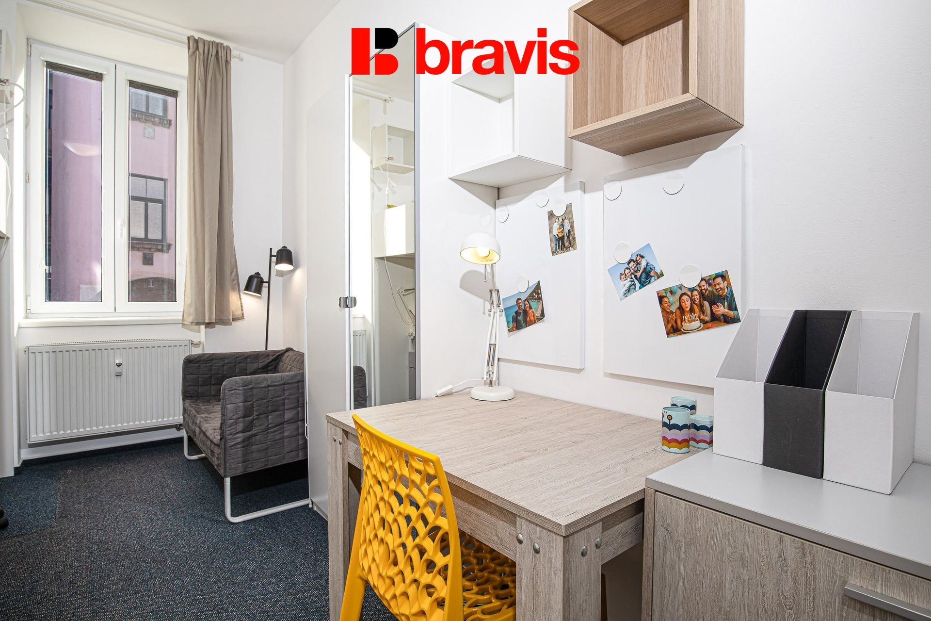 Rozkládací pohovka, pracovní stůl s kontejnerem a kancelářskou židlí, jídelní stůl, 2x jídelní židle, police, šatní skříň, konferenční stolek, komoda s kontejnery, obraz, stolní lampa, závěsy, žaluzie, sítě proti hmyzu.