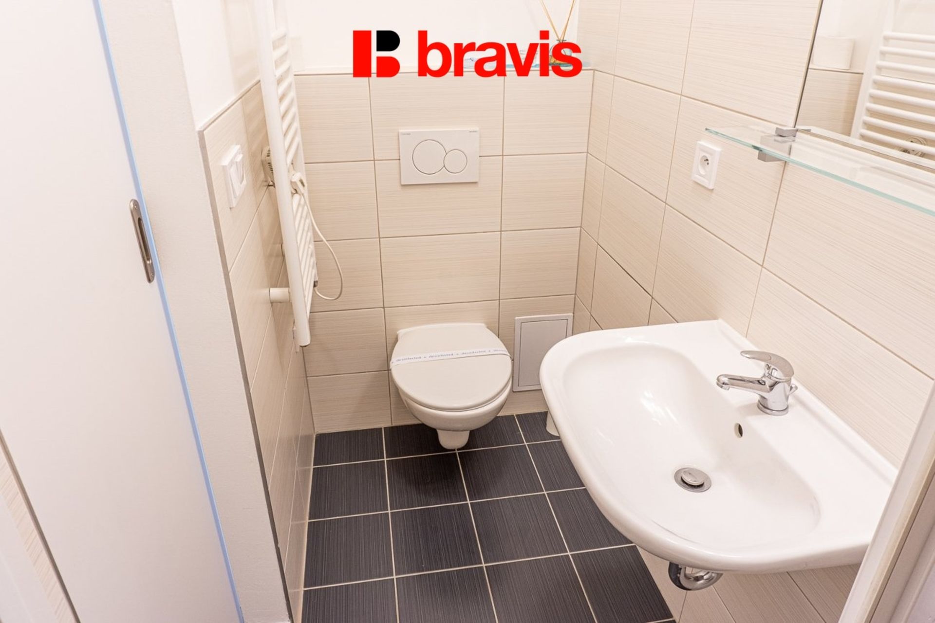 WC, umyvadlo, zrcadlo, police, sprchový kout, topný žebřík.