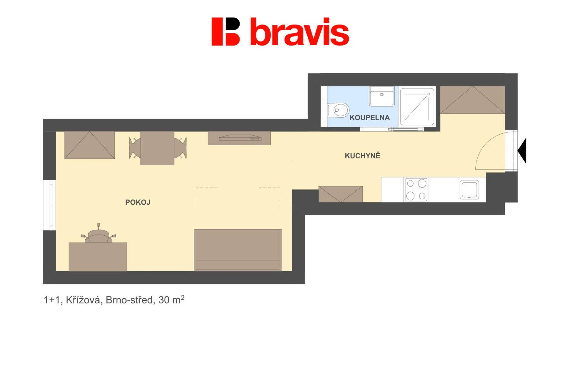 Ve výhradním zastoupení majitele nabízíme k pronájmu byt o dispozici 1+1 na ulici Křížová, Brno - střed. Byt o ploše 30 m2 se nachází v 1. patře bytového domu v klidném vnitrobloku v blízkosti Mendlova náměstí.