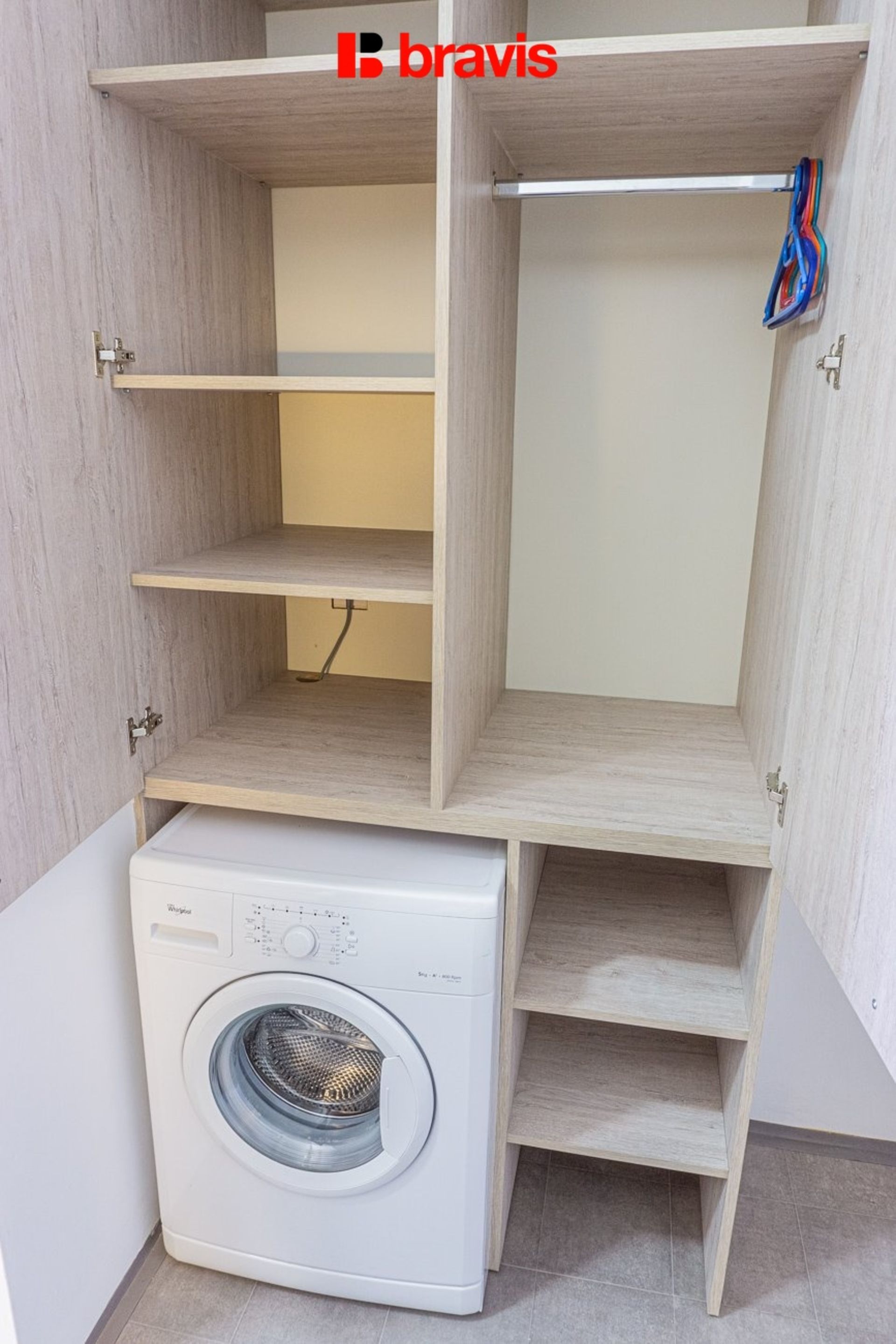 Vestavěná šatní skříň, věšáková stěna, pračka, sušák na prádlo. Každý byt je také vybaven lůžkovinami.