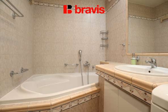 Nová kuchyňská linka s proti linkou je vybavená sporákem a lednicí. Koupelna je s rohovou vanou a pračkou, toaleta je samostatně. Samostatný pokoj má vstup na zasklenou lodžií s výhledem do klidného parku s dětským hřištěm. Byt má unikátní prostornou chodbu s vestavěnou skříní a také zádveřím, které lze využít například jako pracovní kout.