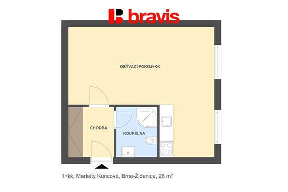 Byt se nachází ve zvýšeném přízemí cihlového domu. Celková plocha bytu je 26 m2.