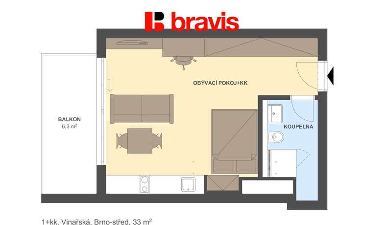 Pronájem bytu 1+kk, Brno - Pisárky, Vinařská ulice, zařízený, balkon, sklep, garážové stání