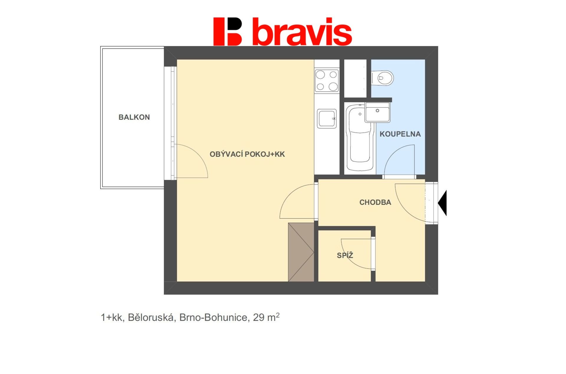 Ve výhradním zastoupení majitele nabízíme k dlouhodobému pronájmu byt o dispozici 1+kk v Brně - Bohunicích na ulici Běloruská. Byt se nachází ve 4. patře panelového domu. Celková plocha bytu je 29 m2.