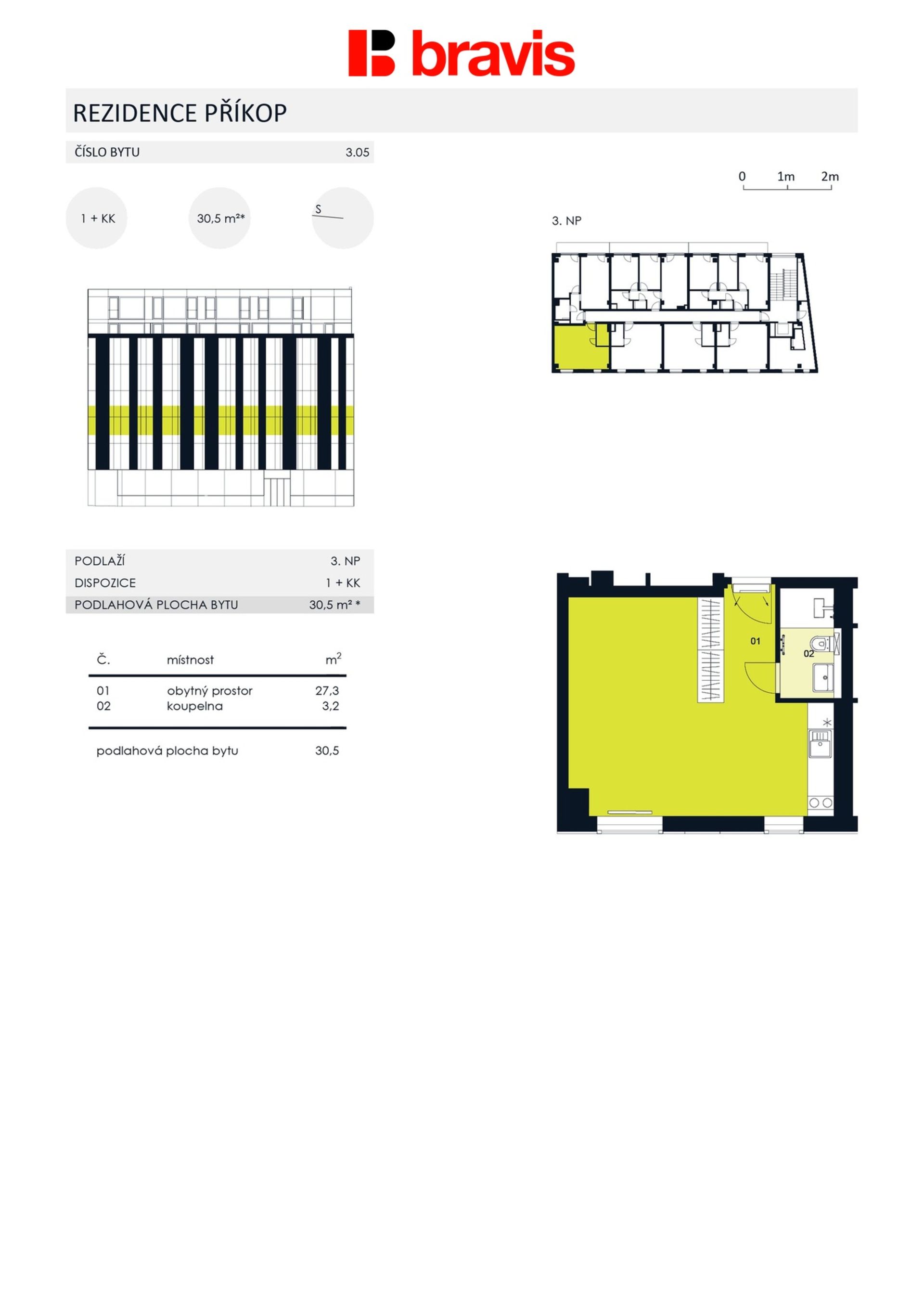 Inzerovaný byt 1kk o celkové ploše 30 m2 se nachází ve 3.NP, přesné umístění uvidíte na fotografiích.