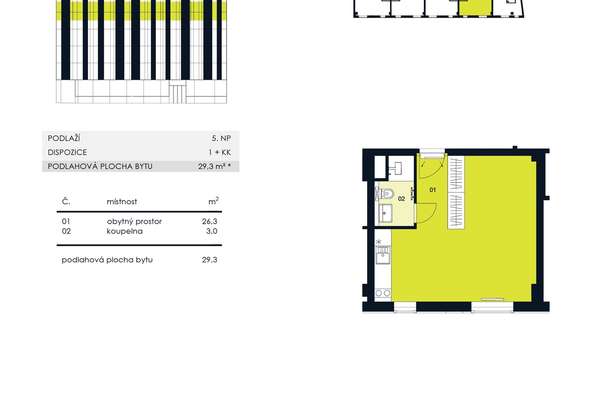 Byt o celkové ploše 30 m2 se nachází v 5 patře bytového domu s výtahem.