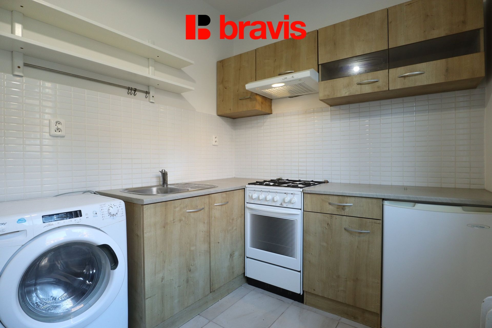 Kuchyňský kout je vybaven linkou se spotřebiči (trouba s plynovým sporákem, digestoř, lednice s mrazícím boxem, pračka).