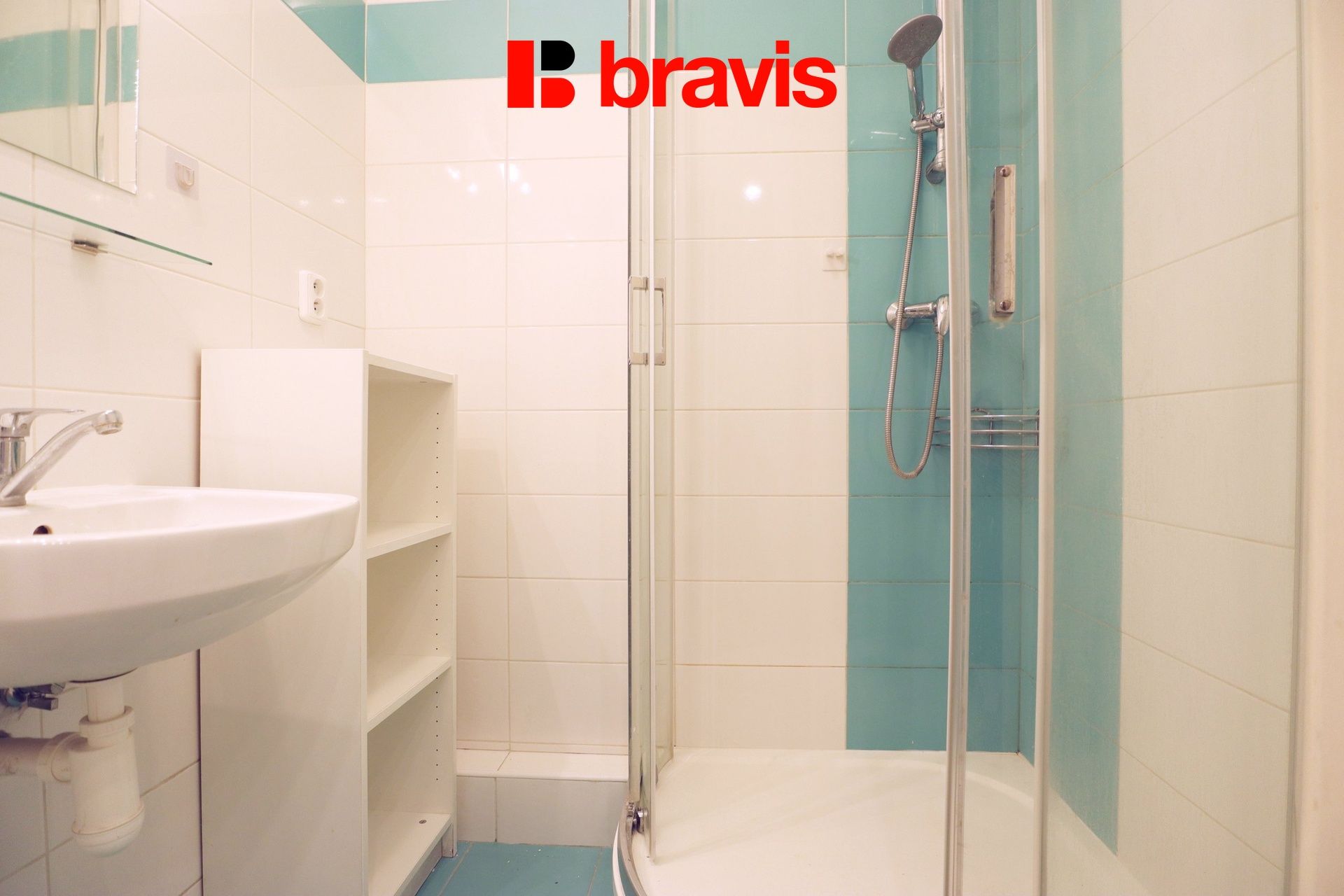 V koupelně je sprchový kout, umyvadlo, zrcadlo a koupelnová skříňka.