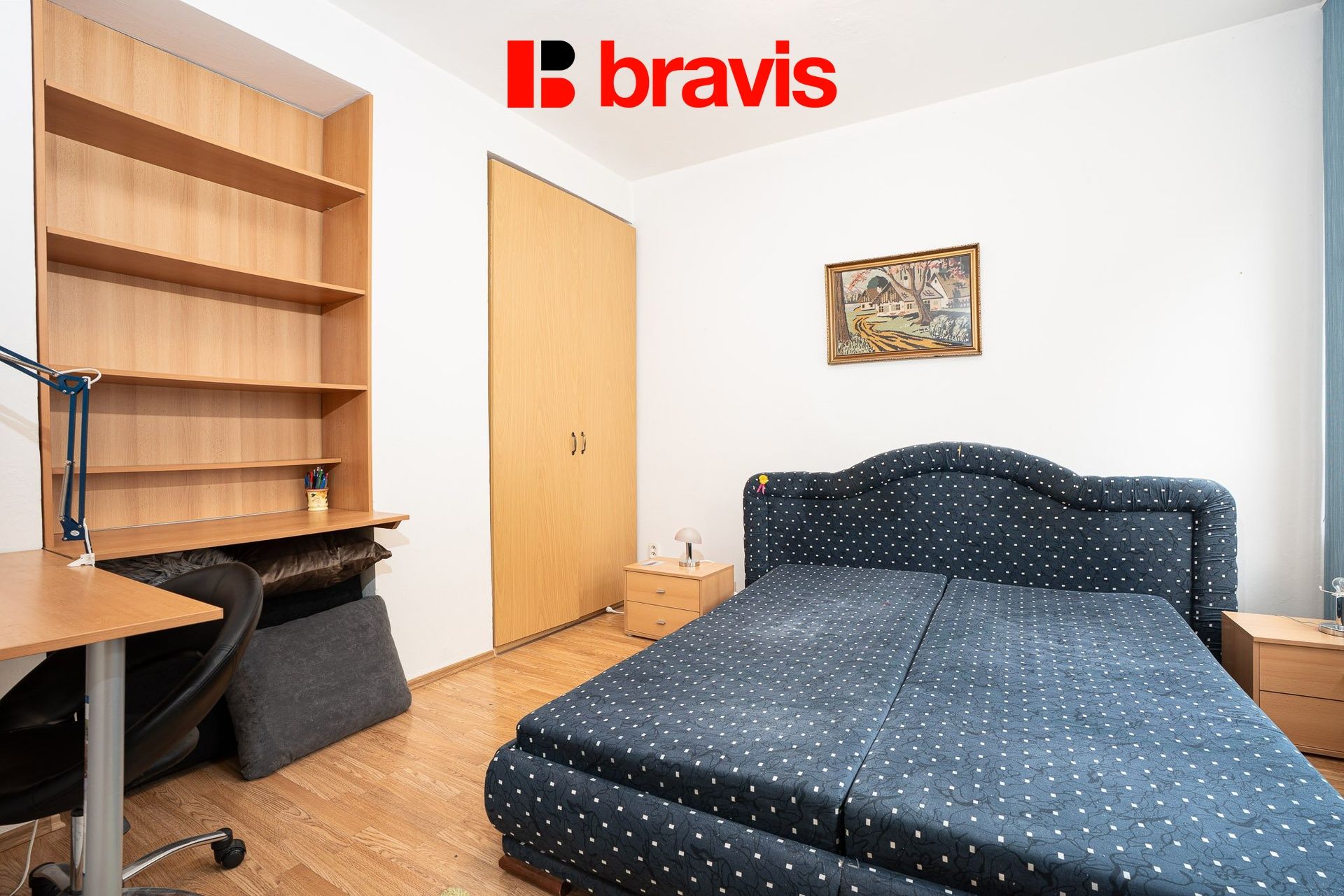 Ložnice je vybavena manželskou postelí, šatní skříní a pracovním stolem.