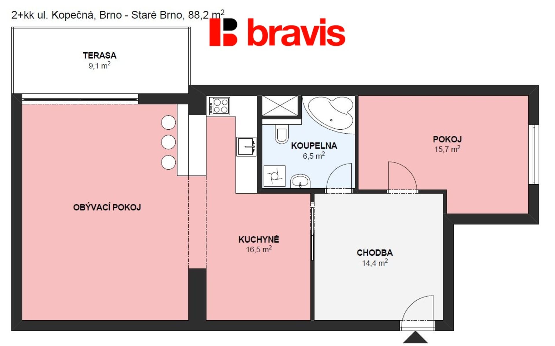 Byt o celkové ploše 87,4 m2 + terasa (9 m2) se nachází ve 2. patře bytového domu s výtahem.