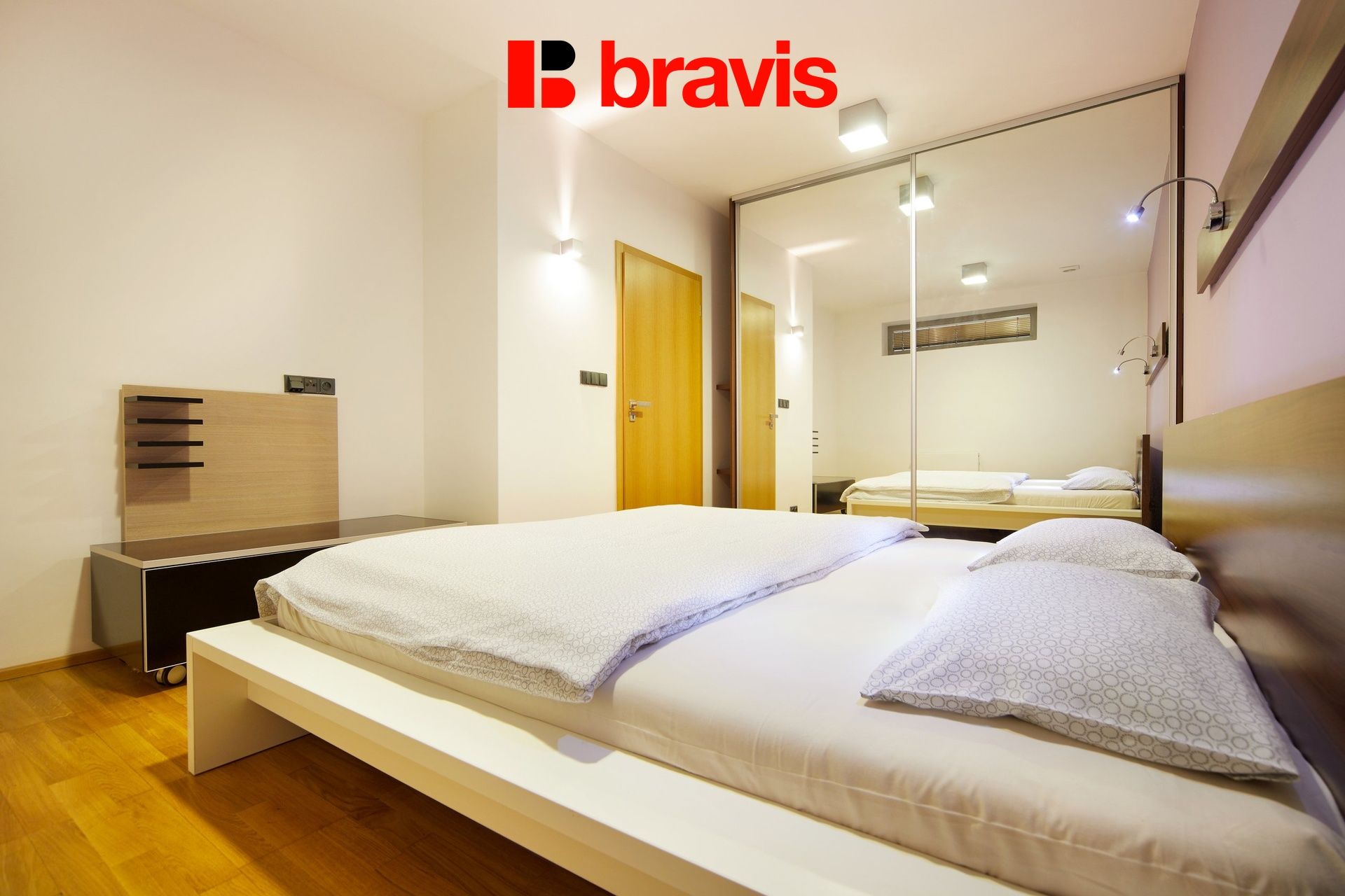 Kompletní vybavení bytu: Kuchyňská linka včetně všech spotřebičů (varná deska, trouba, odsávač par, lednice s mrazákem, mikrovlnná trouba, myčka nádobí), TV stolek, dvoulůžko včetně matrací, vestavěná skříň, pračka, umyvadlo, sprchový kout, WC, žaluzie, dřevěné dveře, dřevěné podlahy, světla.