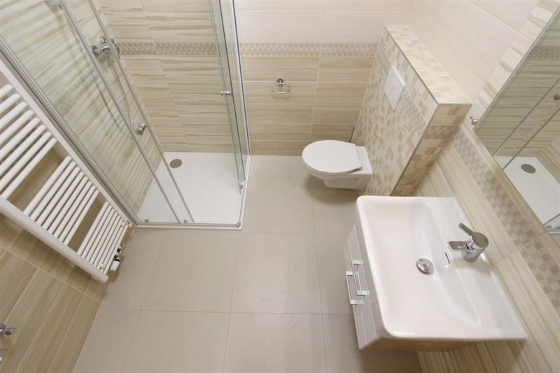 Koupelna je vybavena sprchovým koutem, umyvadlem s umyvadlovou skříňkou, skříňkou se zrcadlem, přípojkou na pračku, otopným žebříkem a toaletou.