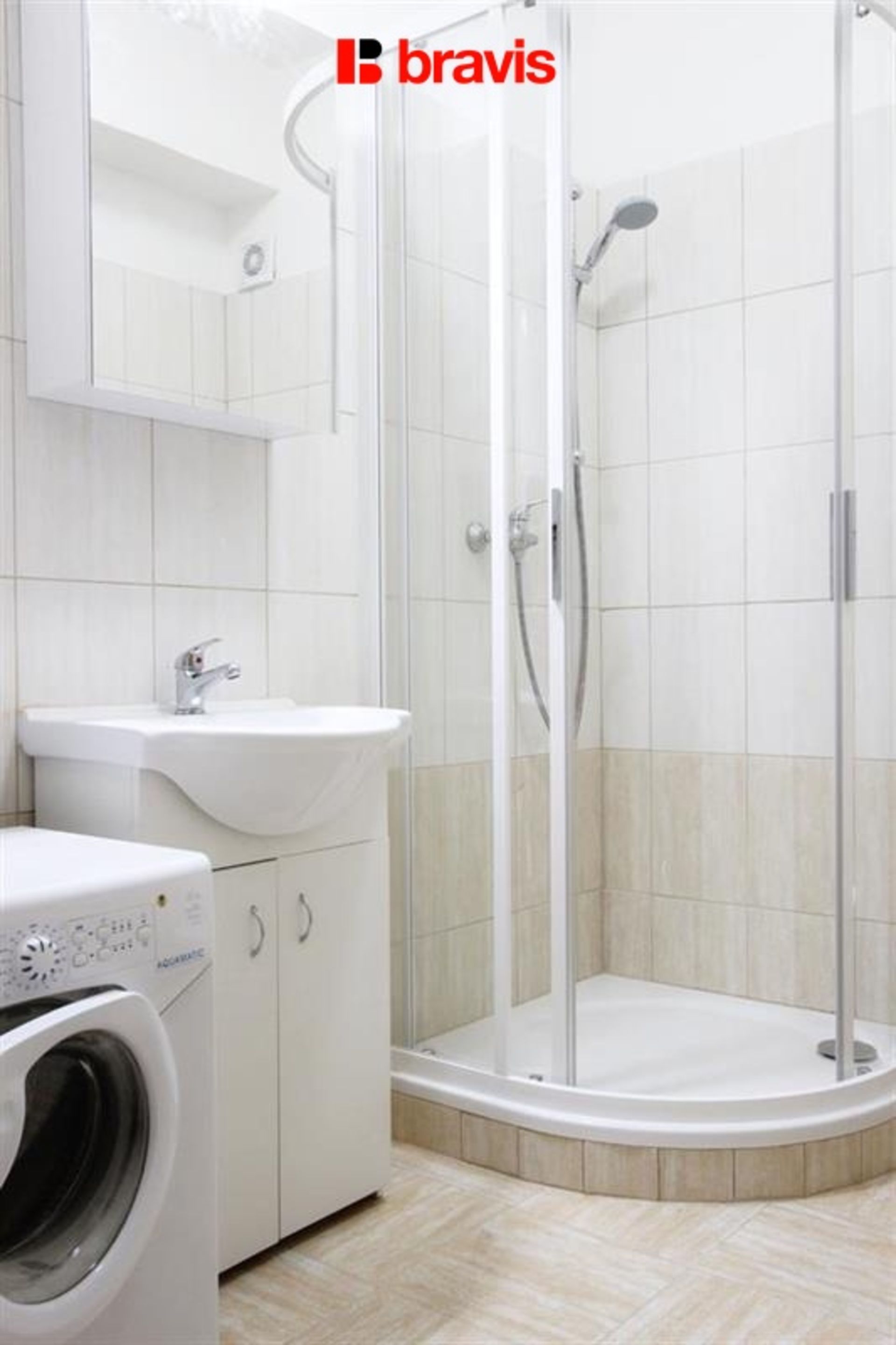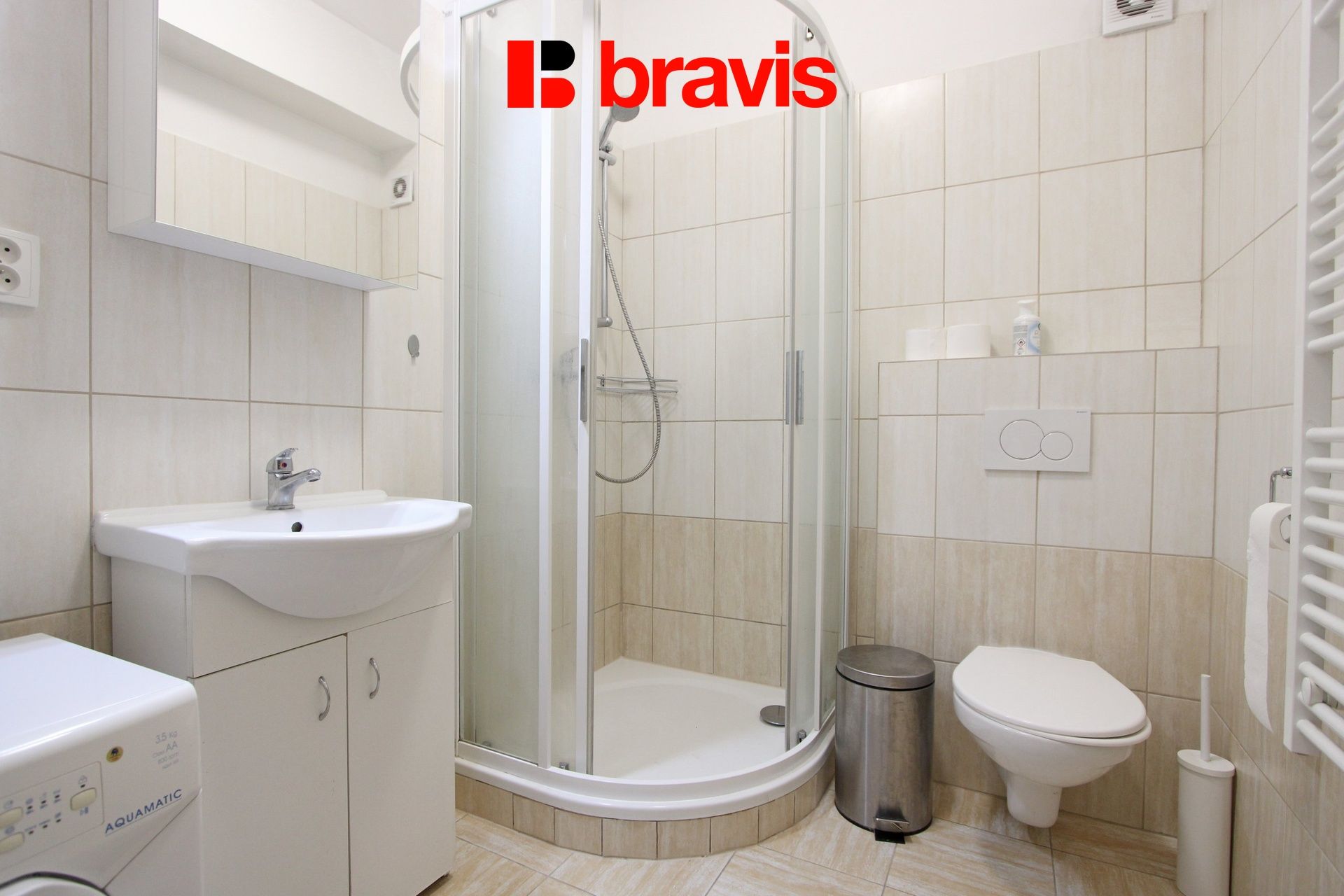 Koupelna je zařízena sprchovým koutem, umyvadlem, zrcadlovou skříňkou, pračkou, plynovým bojlerem a toaletou.