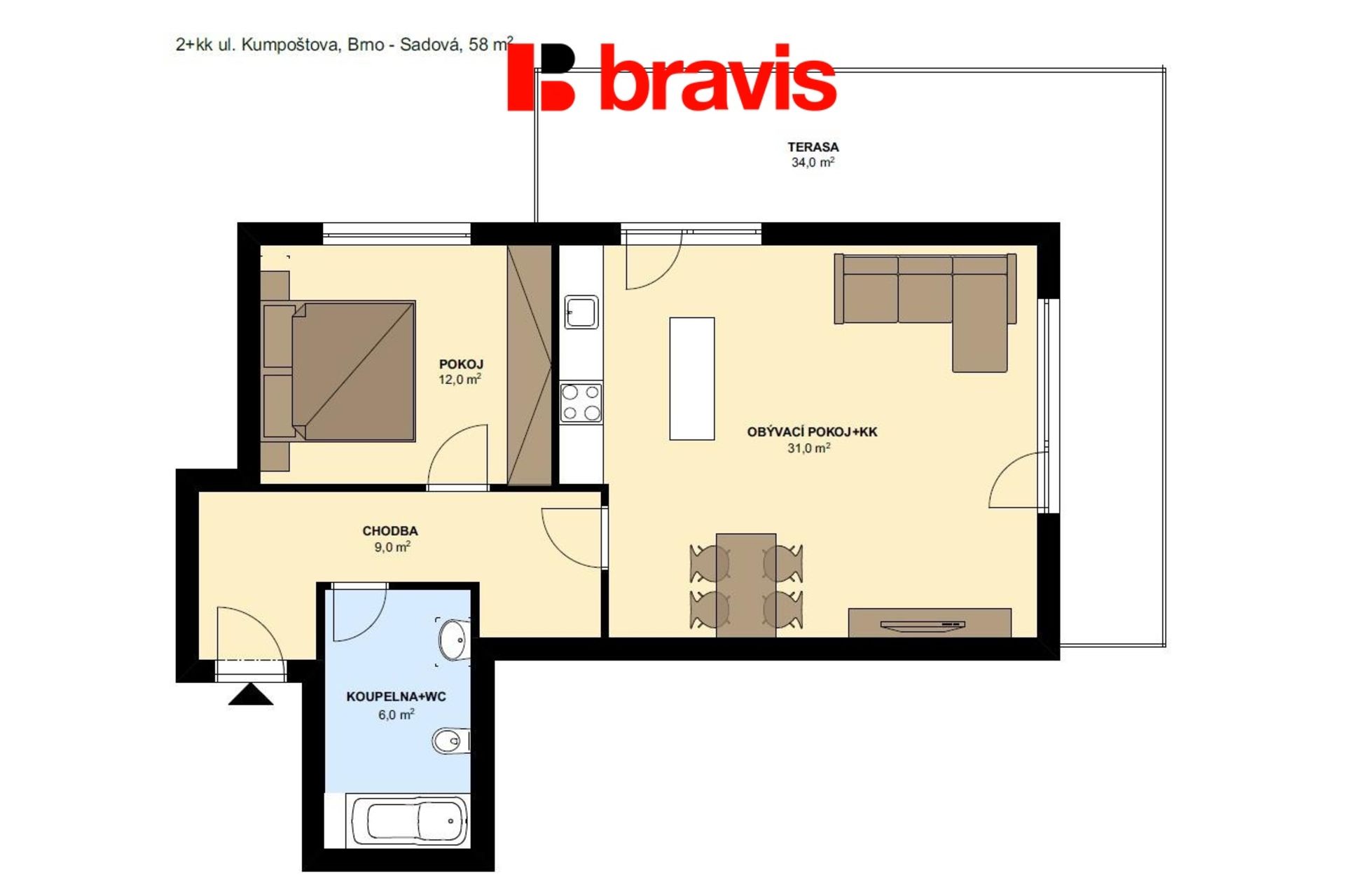 Ve výhradním zastoupení majitele nabízíme k dlouhodobému pronájmu moderně zařízený byt o dispozici 2+kk s velkorysou terasou (34,5 m²), sklepní kójí a garážovým stáním v Rezidenci Panorama Kociánka, na ulici Kumpoštova ve vyhledávané a klidné lokalitě Brno-Sadová s krásnými výhledy na dominanty Brna a výbornou dostupností.