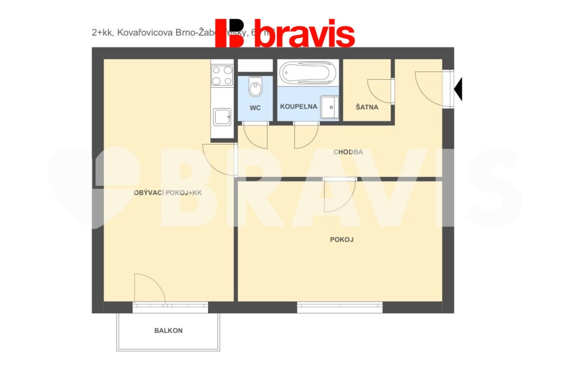 Pronájem bytu 2+kk v Brně - Žabovřeskách, ul. Kovařovicova, balkon, parkovací stání, komora, sklep