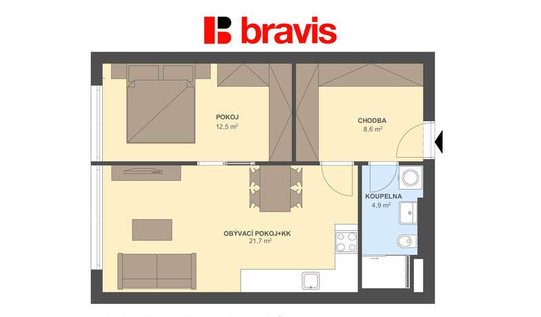 Byt o celkové ploše 50 m2 se nachází ve 3. nadzemním podlaží bytového domu s výtahem.