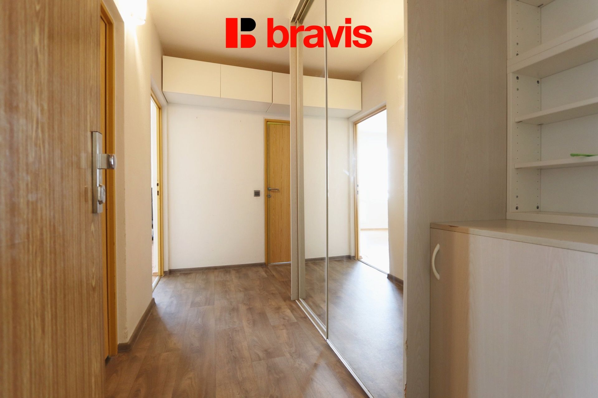 Kuchyně je vybavena kuchyňskou linkou s plynovou varnou deskou, troubou, digestoří, lednicí s mrazákem a jídelním stolem se židlemi. Prostorný obývací pokoj je nezařízený, což dává možnost si jej vybavit dle vlastních představ, a nabízí přímý vstup na balkón. V ložnici naleznete dvě velké šatní skříně, další pokoj je rovněž nezařízený. V předsíni je umístěna další praktická šatní skříň.