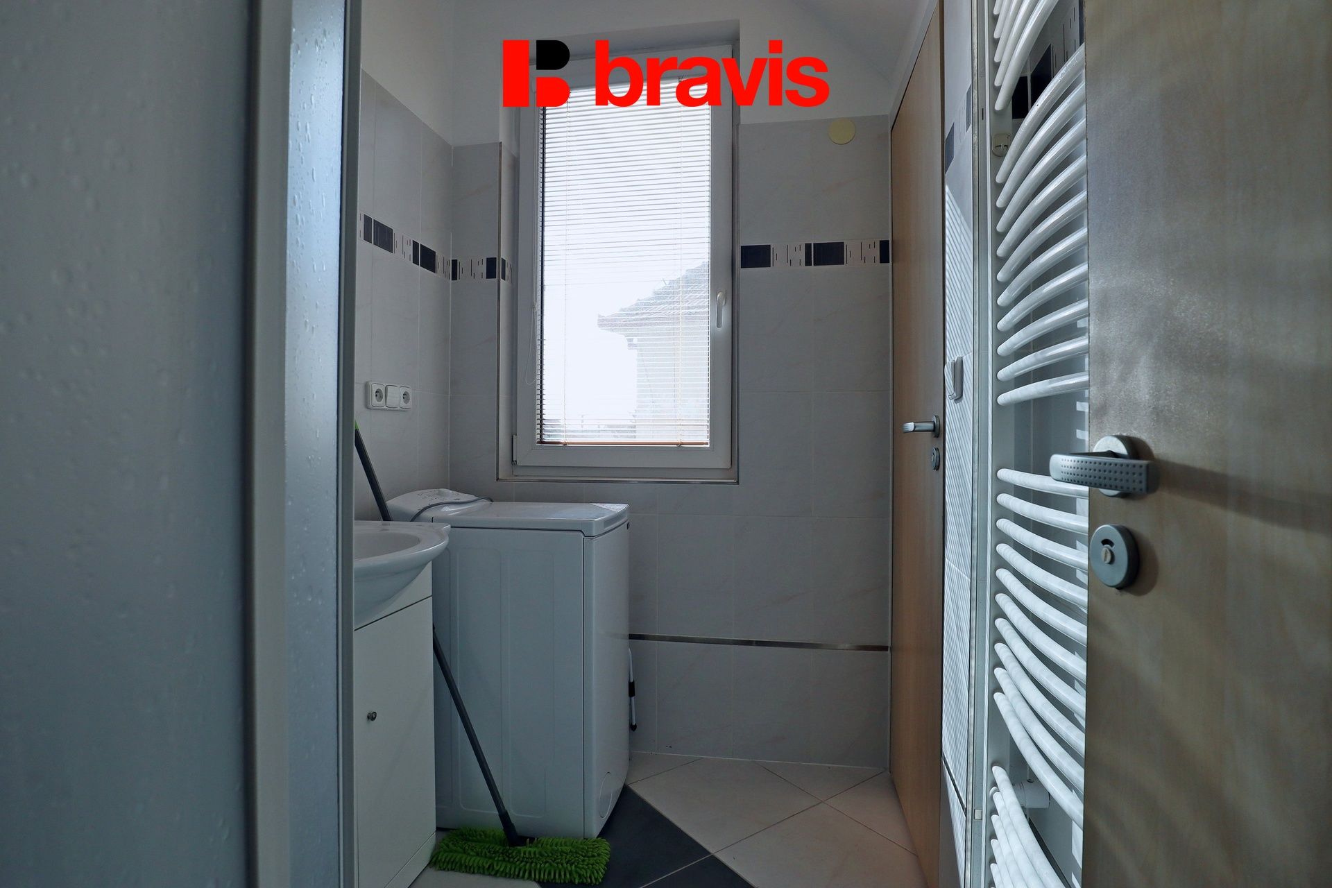 V koupelně je umyvadlo, umyvadlová skříňka, sprchový kout, otopný žebřík, pračka a toaleta.