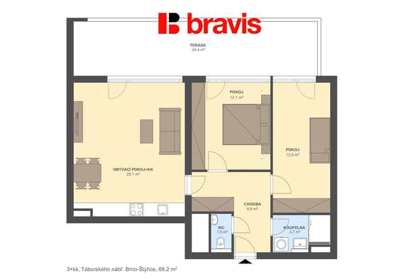 Byt o ploše 69,2 m² se nachází ve 3. nadzemním podlaží novostavby s výtahem. K bytu náleží parkovací stání.