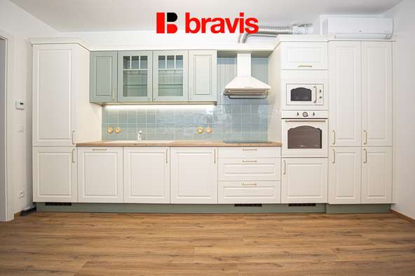 Dominantou bytu je prostorný obývací pokoj s kuchyňským koutem, který je vybaven kuchyňskou linkou včetně vestavných spotřebičů značky Gorenje - lednice s mrazákem, trouba, indukční varná deska, digestoř, mikrovlnná trouba a myčka nádobí.