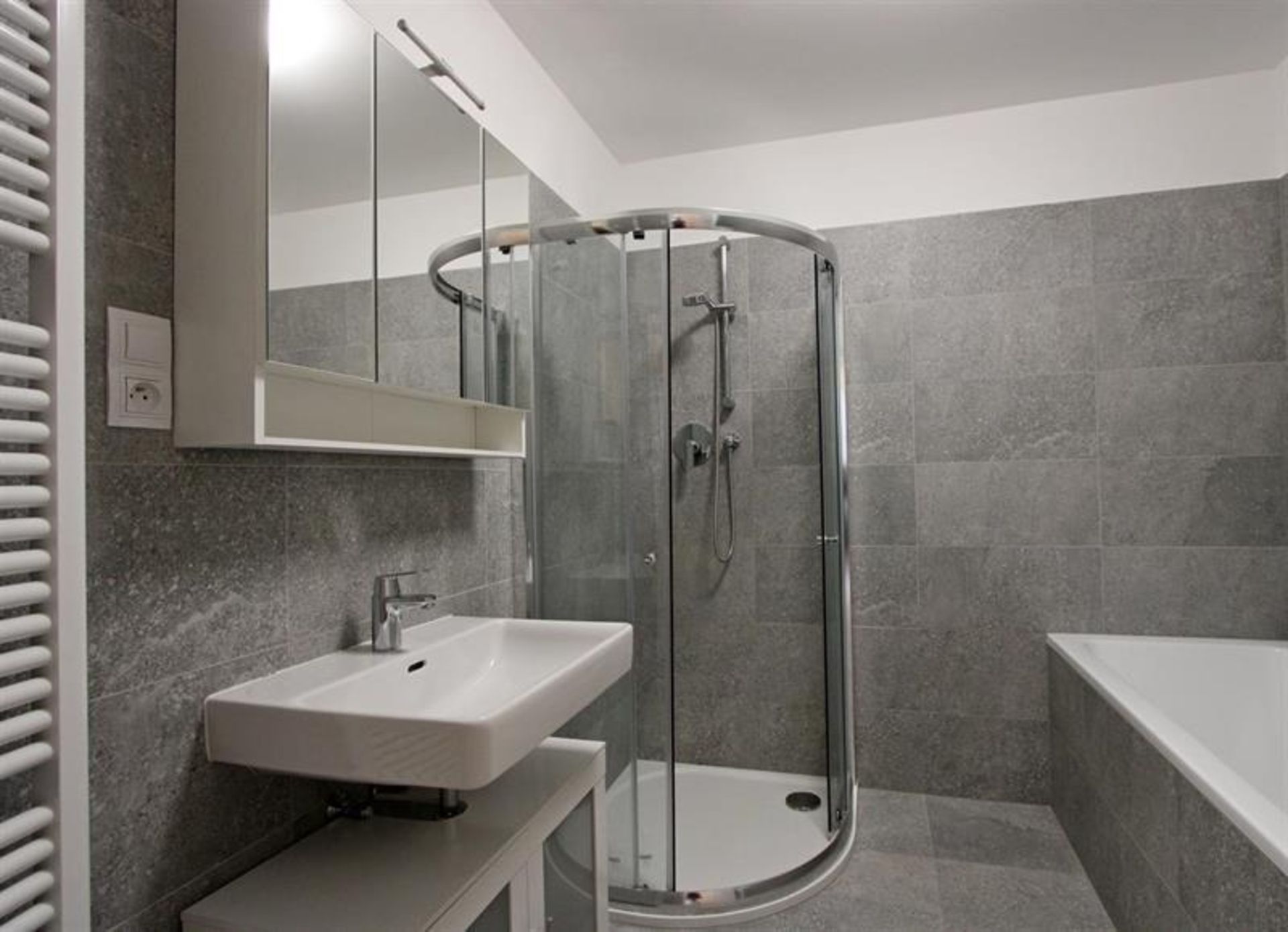 Koupelna je opatřena umyvadlem, sprchovým koutem, vanou a také pračkou.