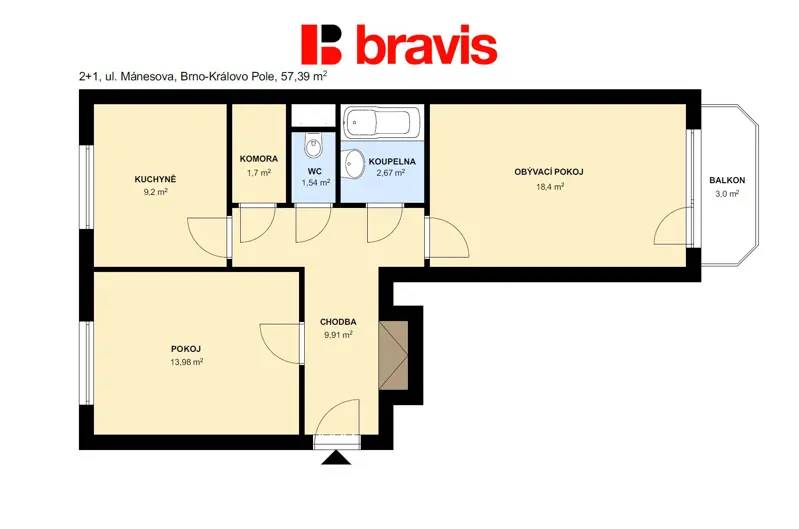 V zastoupení majitele nabízíme k pronájmu byt 2+1, 57,39 m2 je situovaný v 1. patře cihlového domu bez výtahu.