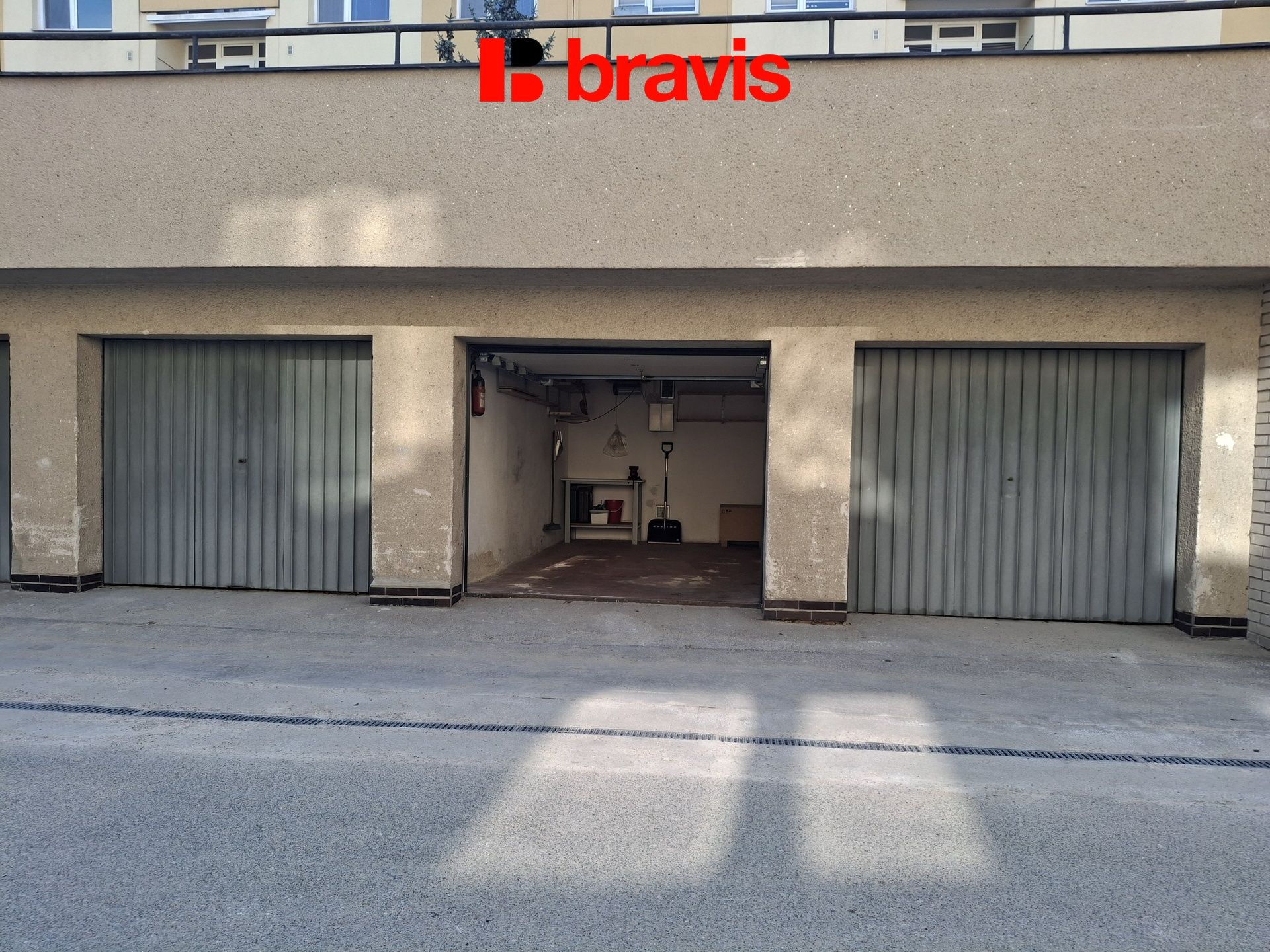 Součástí je zavedená elektřina a sekční vrata na dálkové ovládání, což zajišťuje pohodlný a bezpečný vjezd.