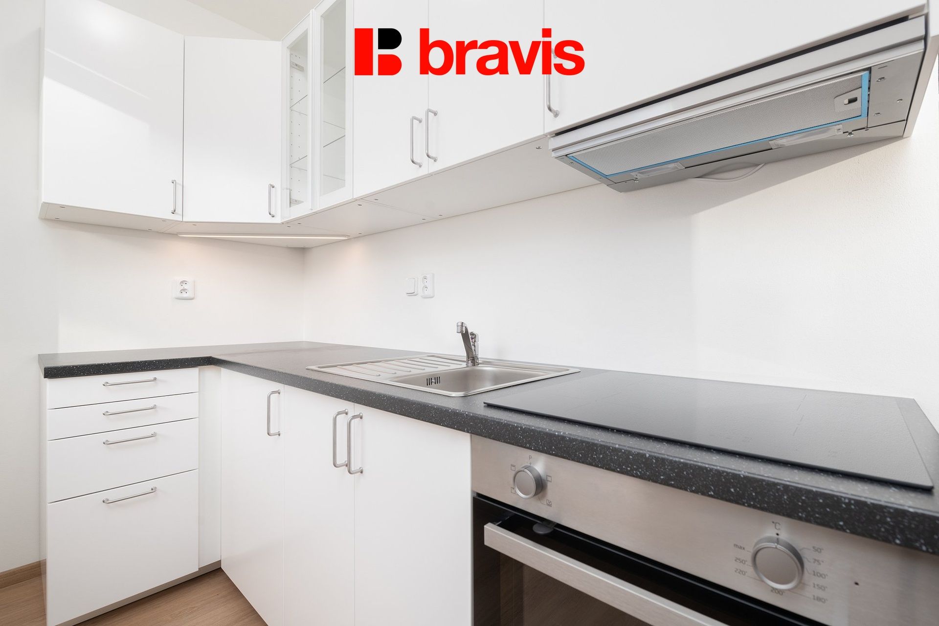 Kuchyně je vybavena kuchyňskou linkou v nadčasovém bílém designu s varnou deskou, troubou, digestoří a chladničkou s mrazákem. Obytná část, ze které je vstup na prostorný balkón, je vybavena šatní skříní a obývací stěnou.
