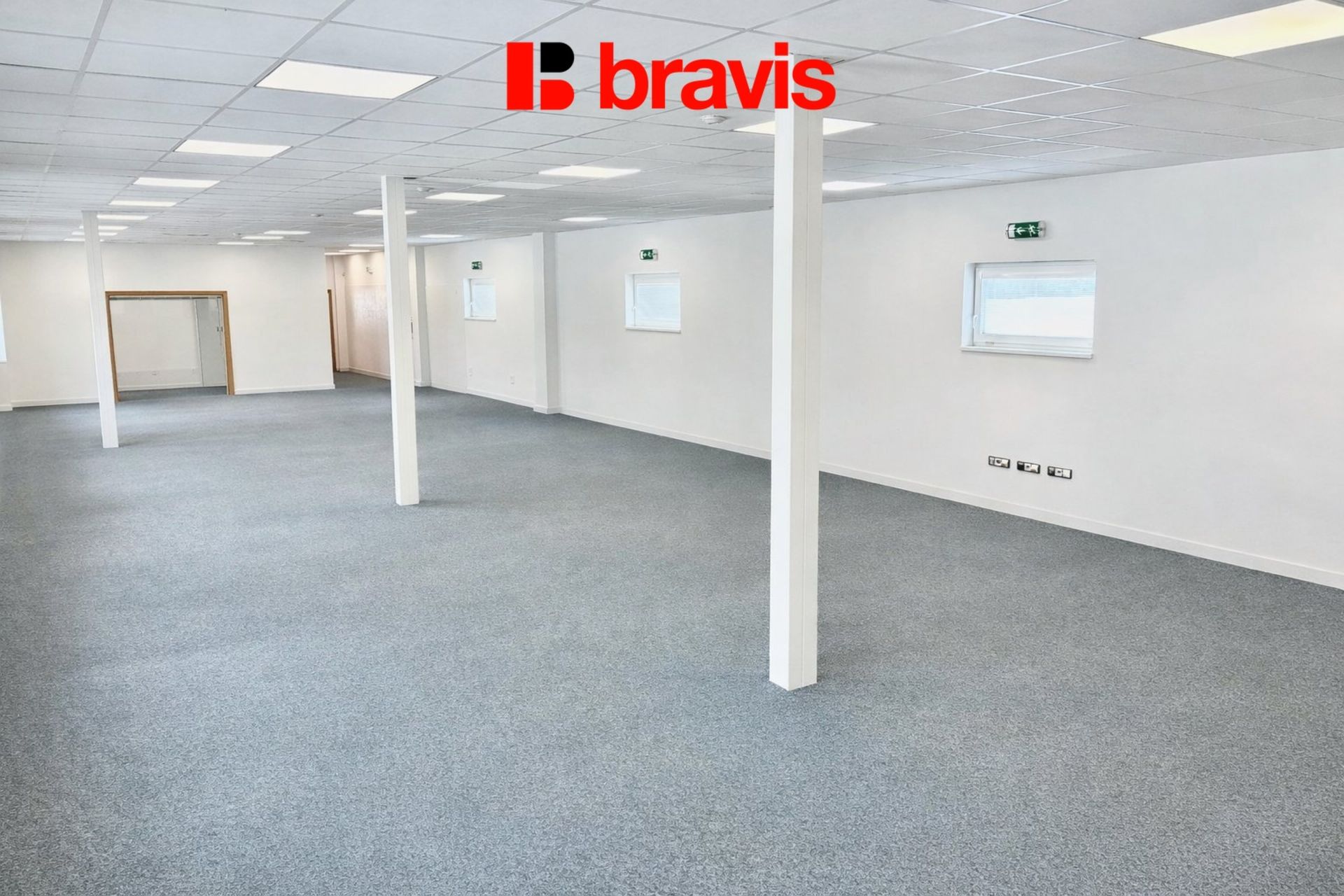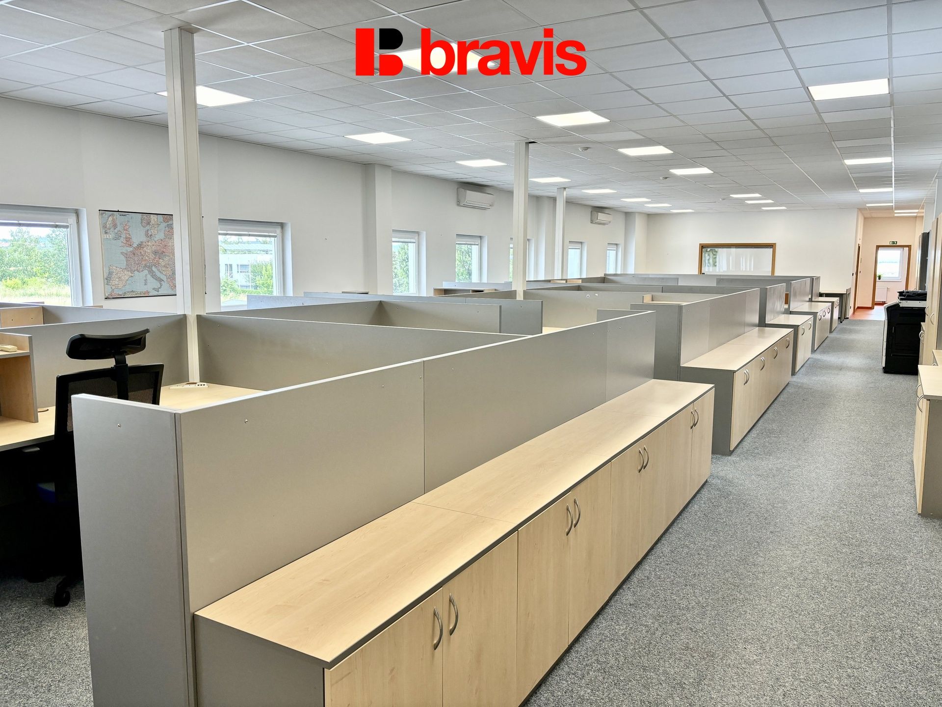 Klimatizované kanceláře o celkové velikosti 257 m2 se nachází v 1. NP budovy, skládají se z jedné velké místnosti o velikosti 172 m2 a dvou místností o velikosti 14,4 m2 a 28,9 m2, které jsou od hlavní otevřené části odděleny dveřmi a okny, mohou sloužit např. jako zasedací místnosti. Kanceláře jsou zařízeny nábytkem, po dohodě je možné je i vyklidit, okna jsou vybavena žaluziemi, na podlaze je položen koberec. Kanceláře se rozprostírají na celém patře, takže nabízí dostatek soukromí a to i v podobě kuchyňky (11,6 m2) a oddělených toalet (30,1 m2) pro muže a ženy vč. sprchy, které nejsou s nikým sdílené a jsou k dispozici jen nájemci těchto kanceláří.