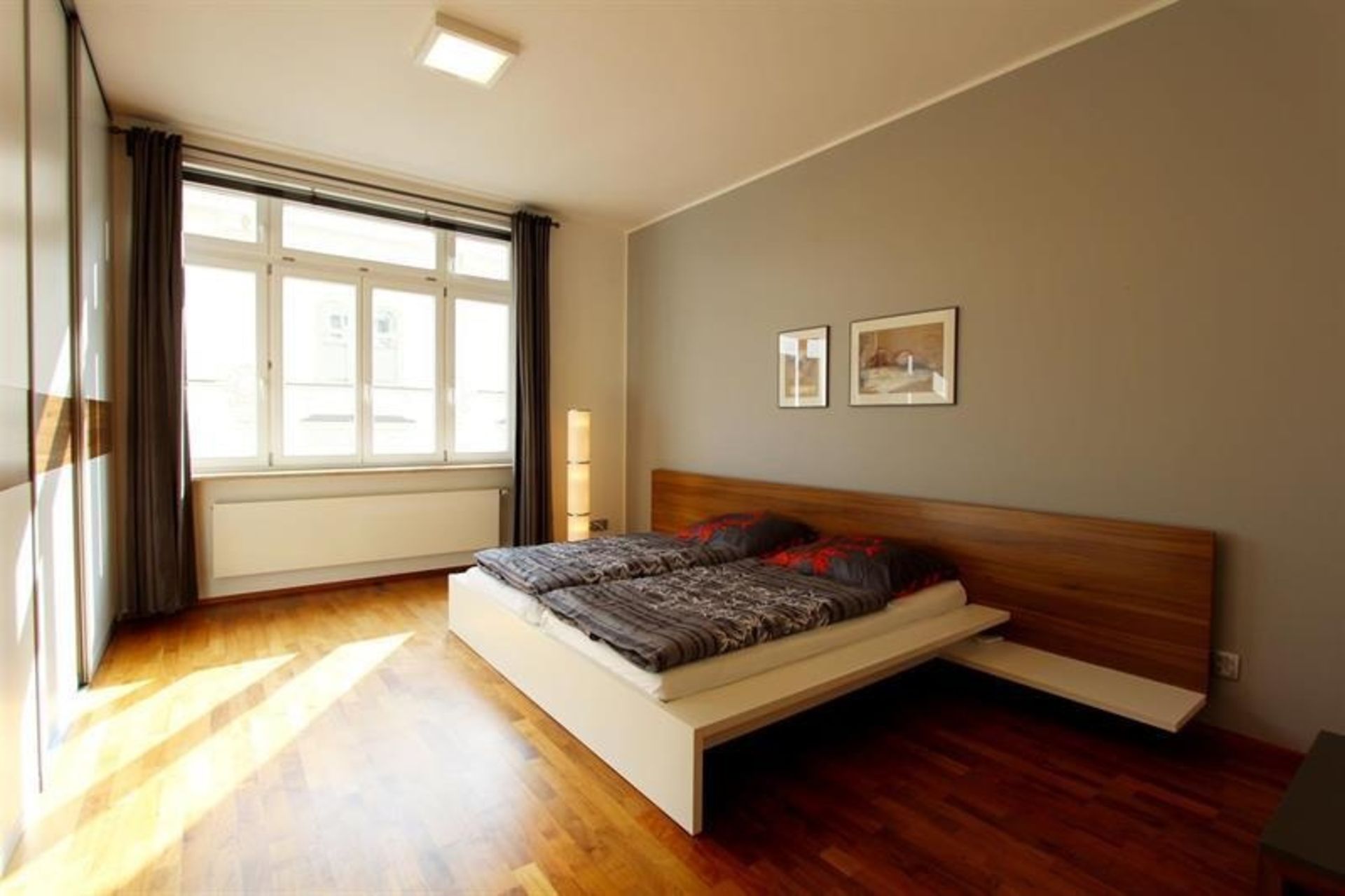 První ložnice (25,6 m2) je vybavena dvojpostelí s nočními stolky, komodami a klimatizací.