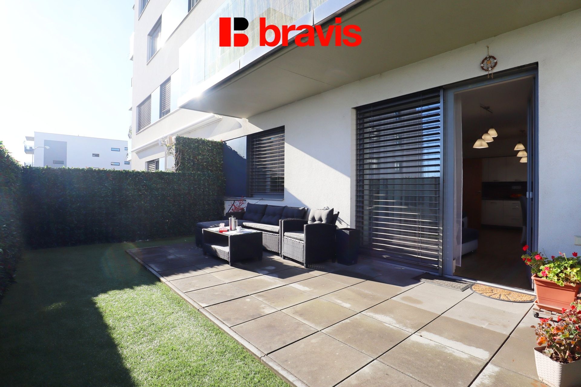 Pronájem moderního bytu 2+kk se zahrádkou, ul. Moskalykova, Brno - Sadová, zařízené, sklep, garážové stání