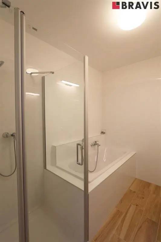Koupelna je vybavená vanou i sprchovým koutem, dále pak umyvadlem a zrcadlem.