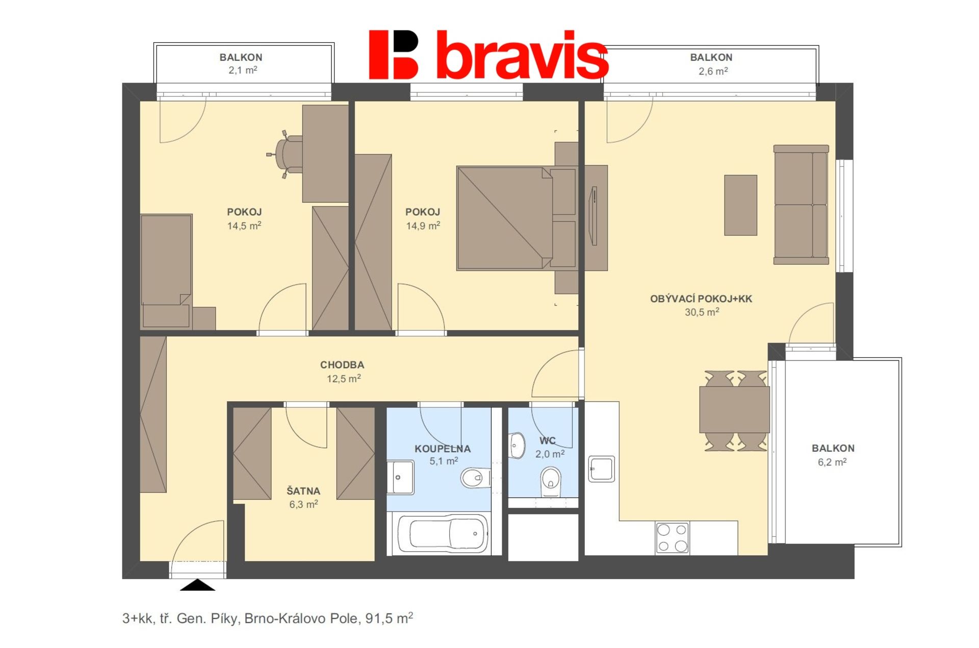 Výhradně nabízíme k pronájmu moderní a prostorný byt dispozice 3+kk o celkové ploše bytu 86 m2 se dvěma balkóny (2,1 a 2,6m2 ) a lodžií (6,2m2 ) v novostavbě domu v žádané lokalitě Brno – Černá Pole, třída Generála Píky.