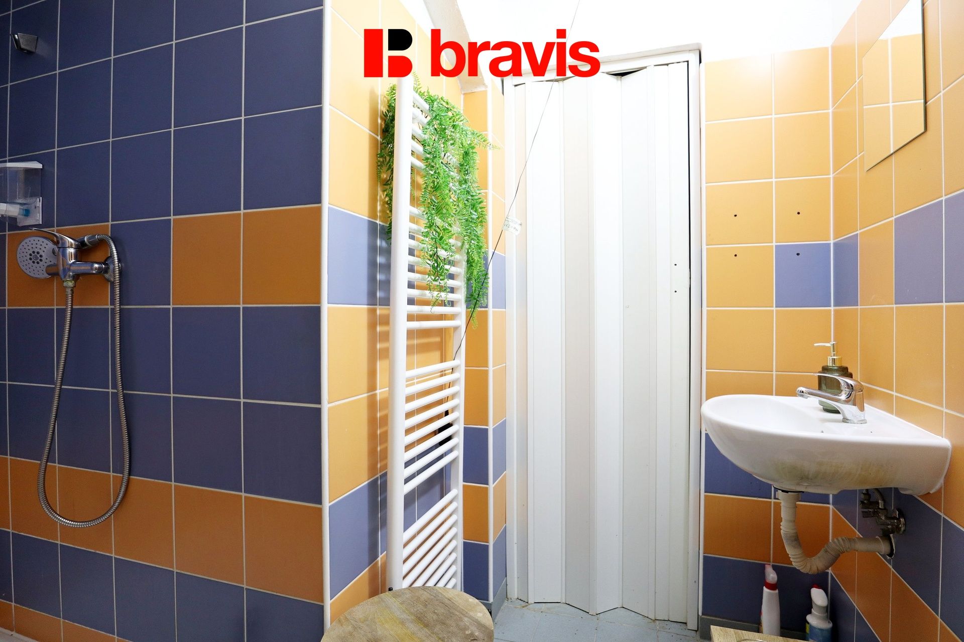 V prostoru je sociální zařízení (sprcha a WC).