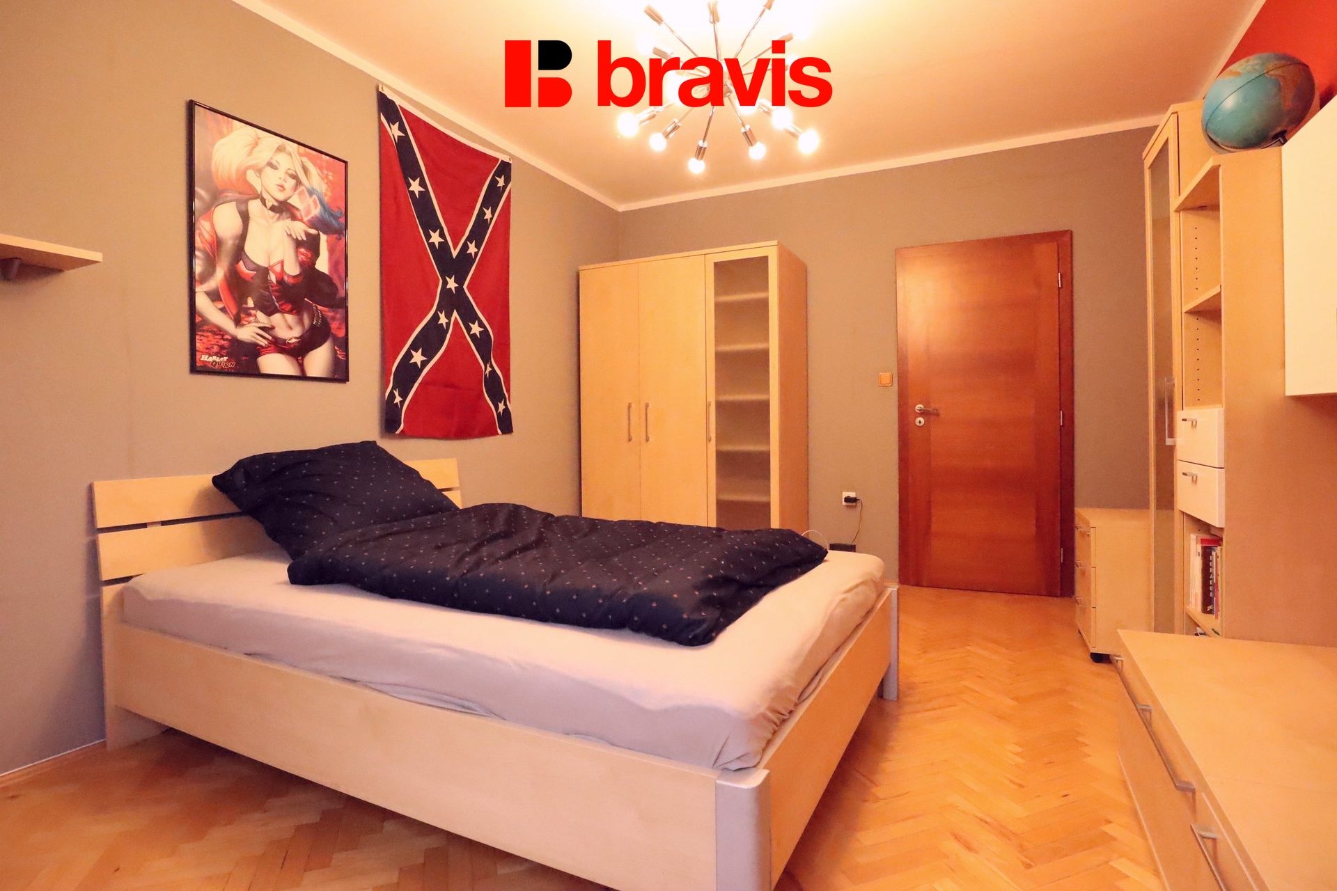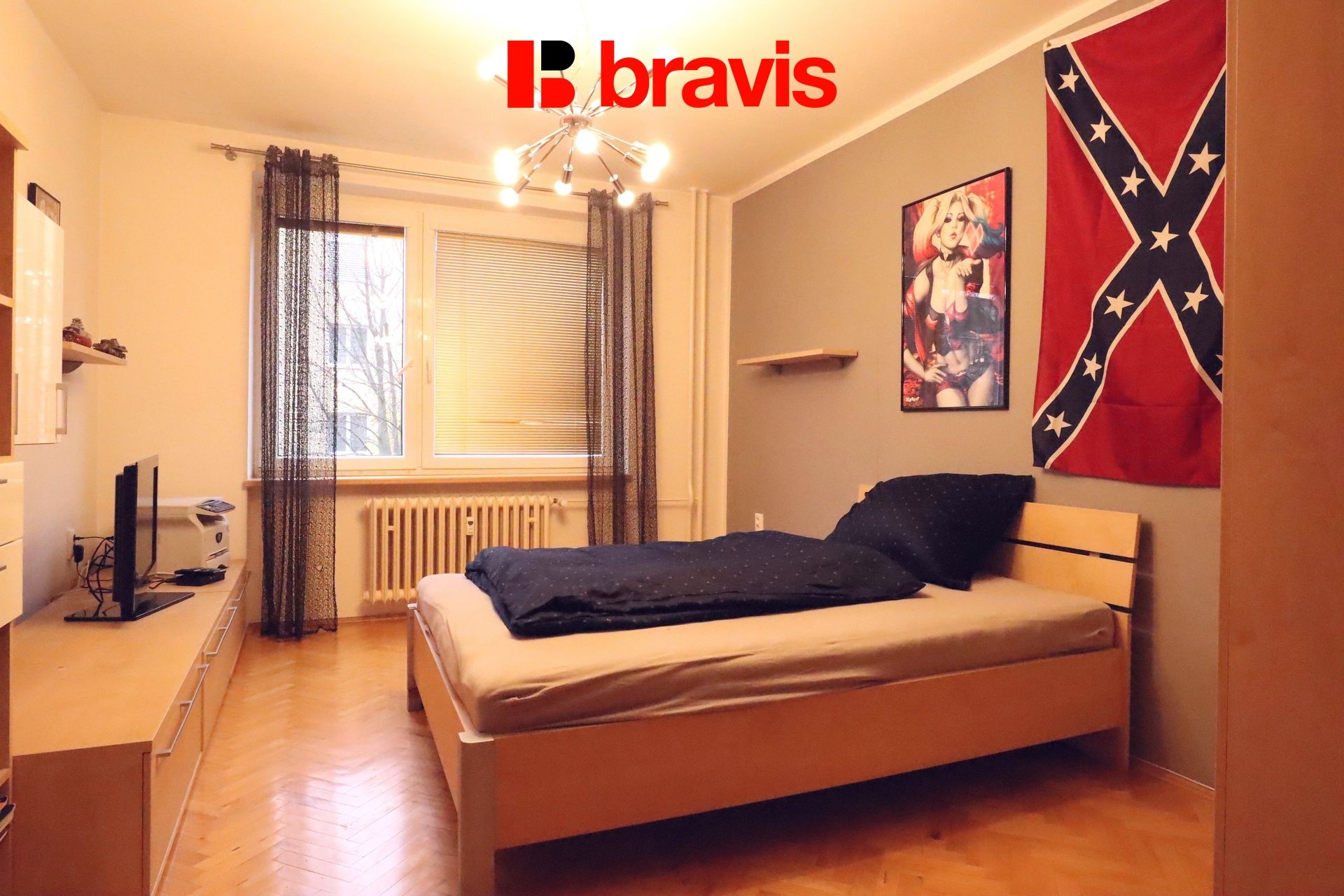 Pokoj je vybaven lůžkem, skříněmi, TV stěnou s televizí.