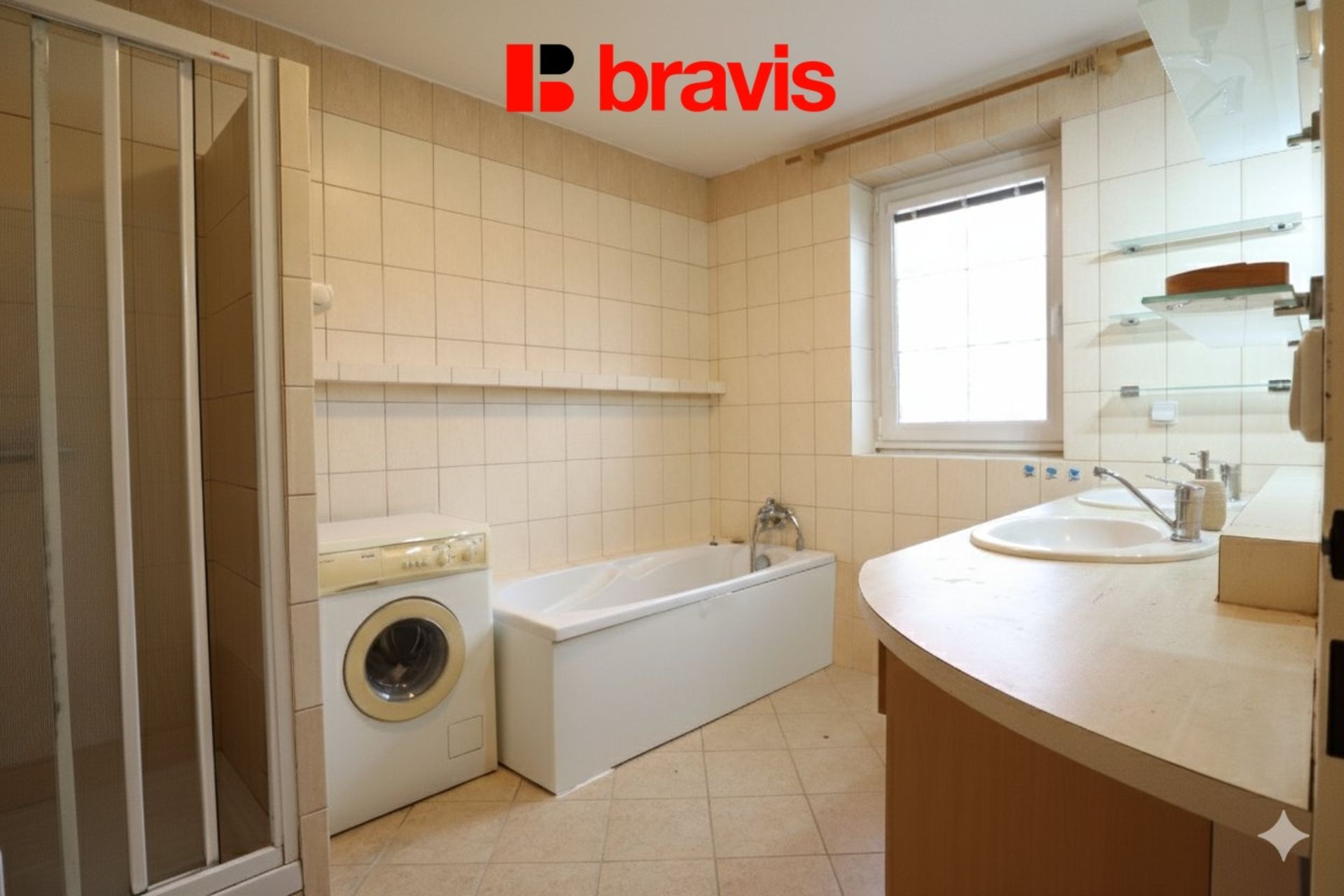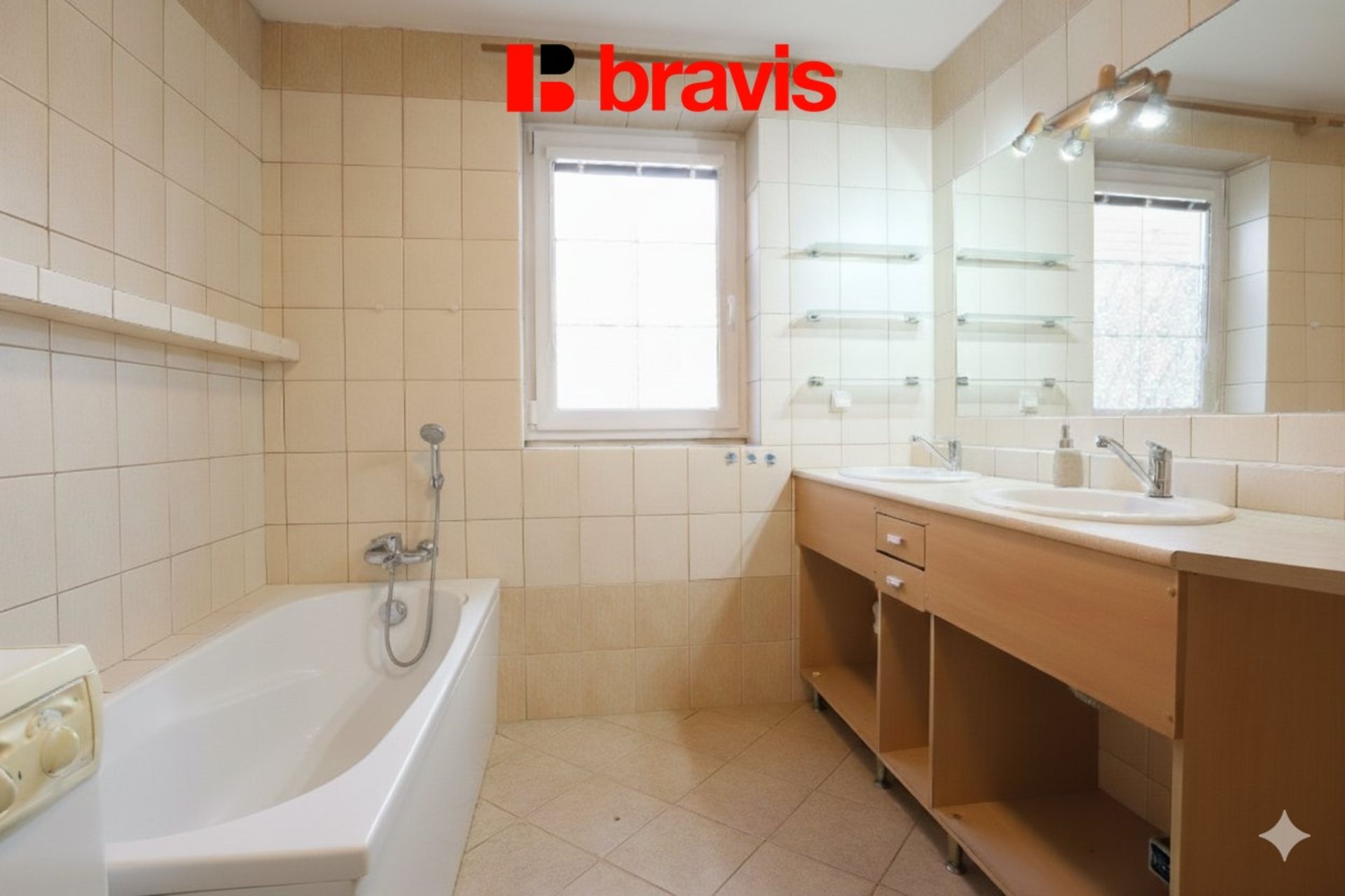 Prostorná koupelna s vanou, sprchovým koutem a dvěma umyvadly a pračkou